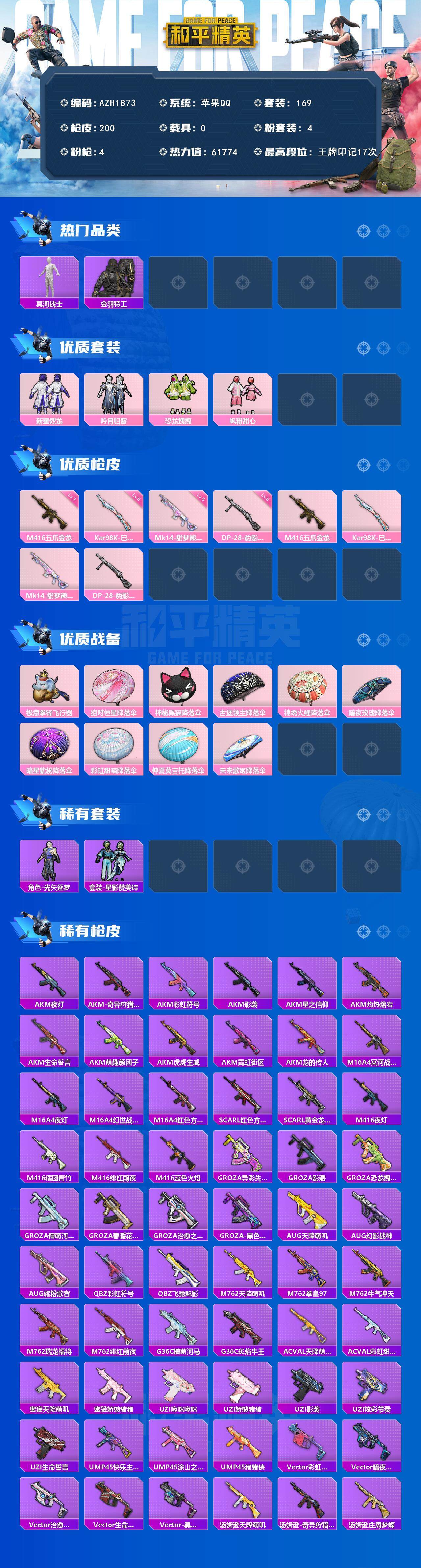【AZH1873】苹果 手Q【17印记 木乃伊深海小丑鱼 满级五爪金龙 粉熊背包】4粉装-4特效枪-0载具-2粉色飞行器-61774热力值-17王牌印记-169套装-200枪皮