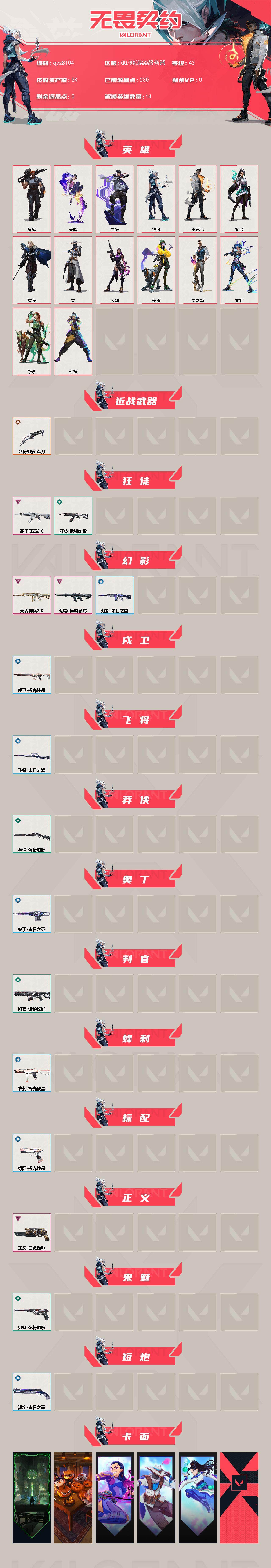 【qyz8104】诡秘蛇影 qyz8104 近战武器皮肤: 诡秘蛇影 步枪皮肤: 幻影-天界神兵2.0,幻影-异鳞魔蛇,狂徒-离子武器2.0 佩枪皮肤: 正义-日冕雄师 亮点: 【qyz8104】【英雄】:幻棱,炼狱,暮蝶,壹决,捷风,不死鸟,贤者,猎枭,零,芮娜,奇乐,尚勃勒,霓虹,斯凯【近战 武器】:近战武器-诡秘蛇影 军刀【狂徒】:狂徒-离子武器//2.0,狂徒-诡秘蛇影【幻影】:幻影-天界神兵//2.0,幻影-异鳞魔蛇,幻影-末日之翼【戍卫】:戍卫-折光棱晶【飞将】:飞将-末日之翼【莽侠