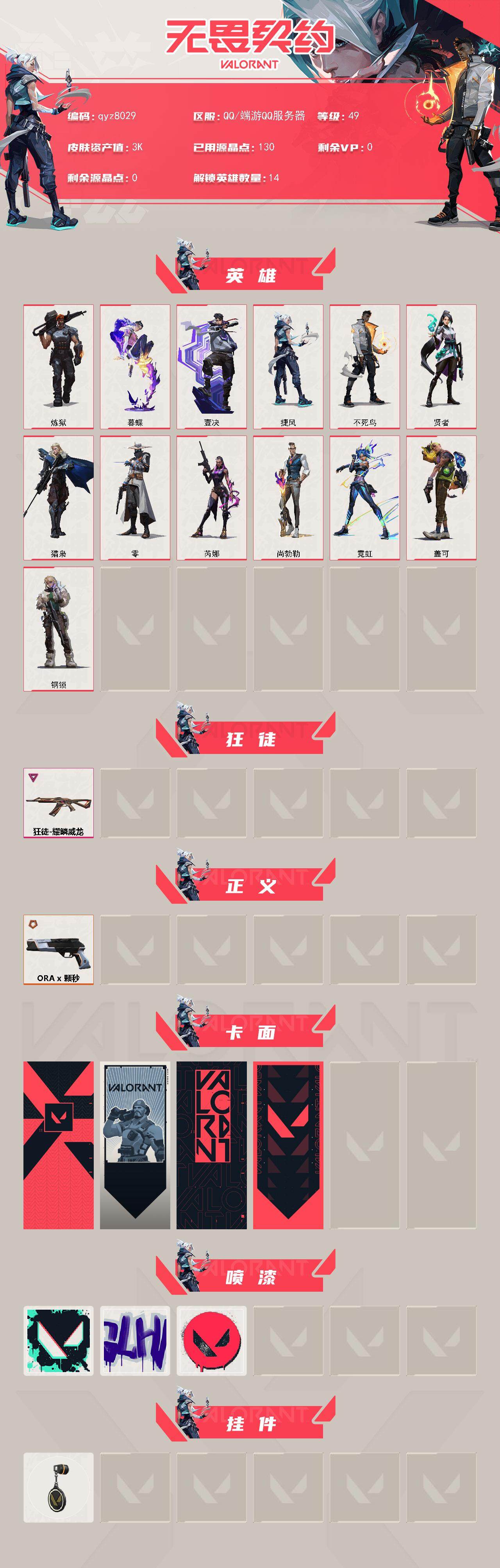 【qyz8029】精品黄金号 耀麟威龙狂徒+颗秒正义喜欢的来吧 qyz8029 步枪皮肤: 狂徒-耀鳞威龙 佩枪皮肤: 正义-ORAx颗秒 亮点: 【qyz8029】【英雄】:炼狱,暮蝶,壹决,捷风,不死鸟,贤者,猎枭,零,芮娜,尚勃勒,霓虹,盖可,钢锁【狂徒】:狂徒-耀鳞威龙【正义】:正义-ORA x 颗秒【卡面】:代号红色 卡面,新兵报到 卡面,V契约 卡面,无畏契约 卡面【喷漆】:胜利属于无畏契约 喷漆,GLHF 喷漆,无畏契约 喷漆【挂饰】:无畏契约 纪念币 挂饰