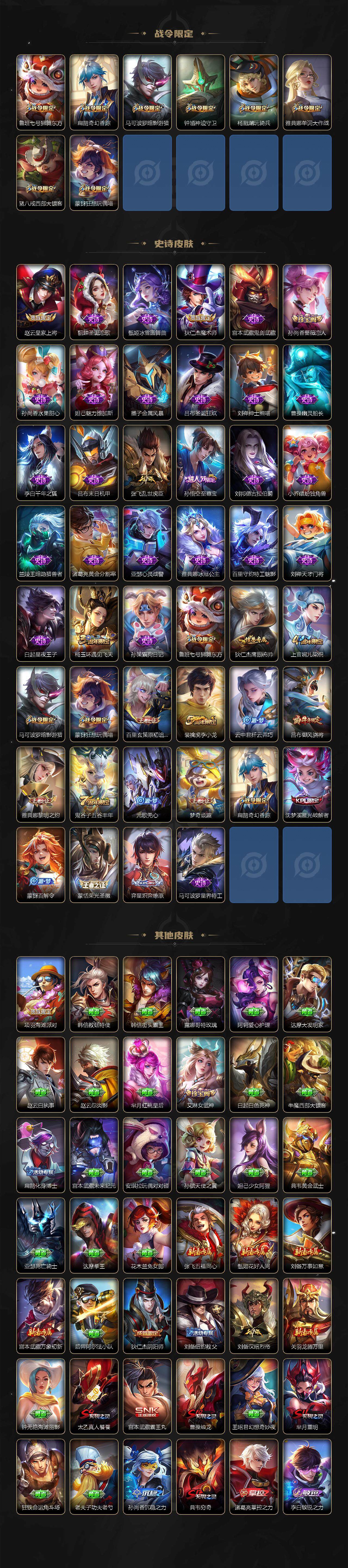 【限定皮肤】:大乔绒语心约,姜子牙天穹之誓,狄仁杰阴阳师,赵云皇家上将,孙尚香蔷薇恋人,鲁班七号狮舞东方,扁鹊奇幻香踪,芈月重明,吕布御风骁将,元歌无心,夏侯惇朔风刀,曹操