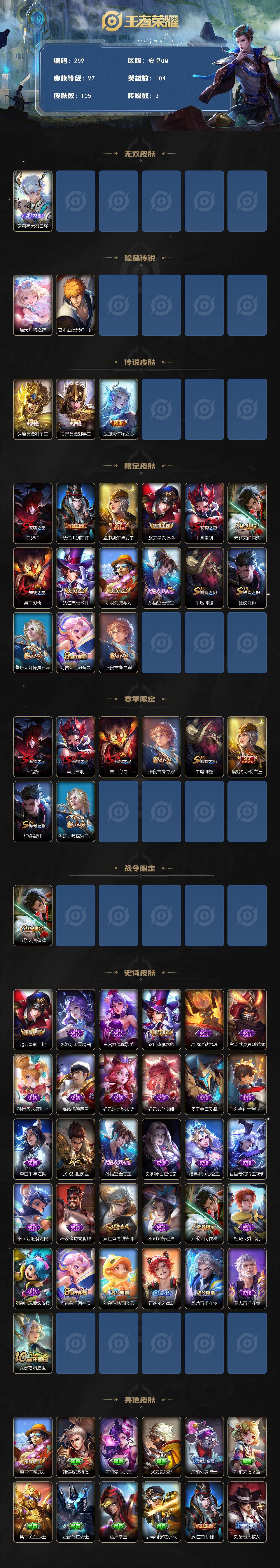 1648534 王者荣耀账号 安卓Q-V7-最强王者段位-104英雄-105皮肤-0典藏-0珍品无双-1无双-2珍品传说-3传说-31史诗