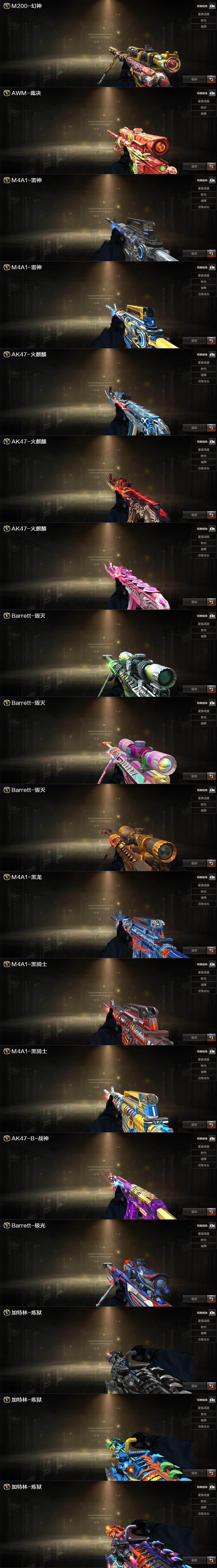 【热门武器】:QBZ03-金色蔷薇,M200-幻神,死亡之眼,荣耀世冠-火麒麟,白虎-电玩蓝兔,柯尔特-冠军之特,M4A1-黑骑士,汤姆逊-烈龙,RPK-盘龙*4,加特林-炼狱*6,沙鹰-修罗,黄金猫猫手套-白鲨