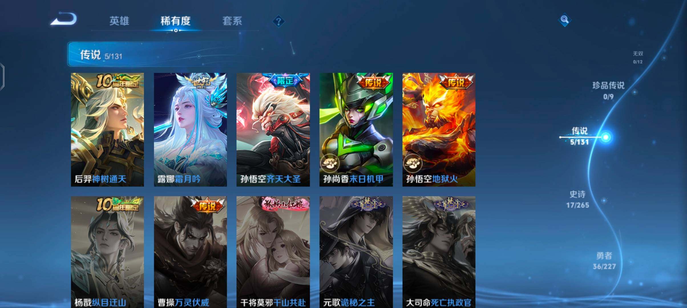 【传说皮肤】:后羿神树通天,露娜霜月吟,孙悟空齐天大圣,孙尚香末日机甲,孙悟空地狱火