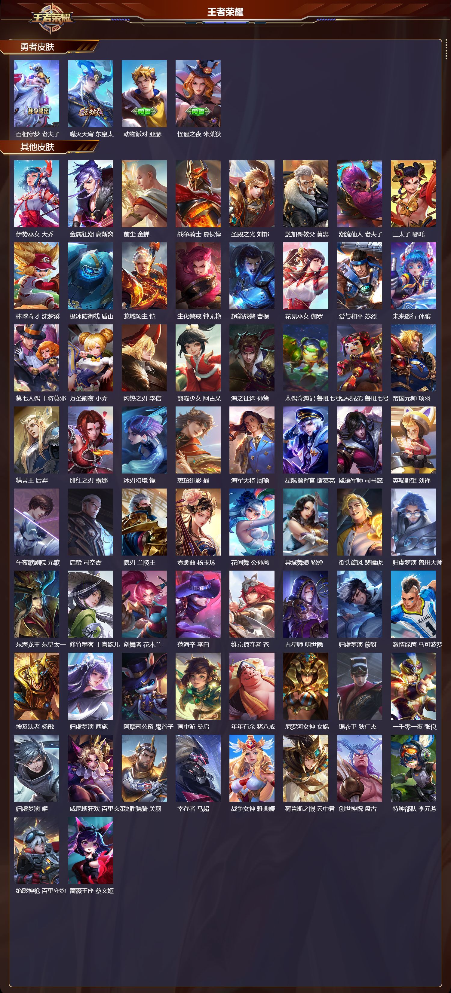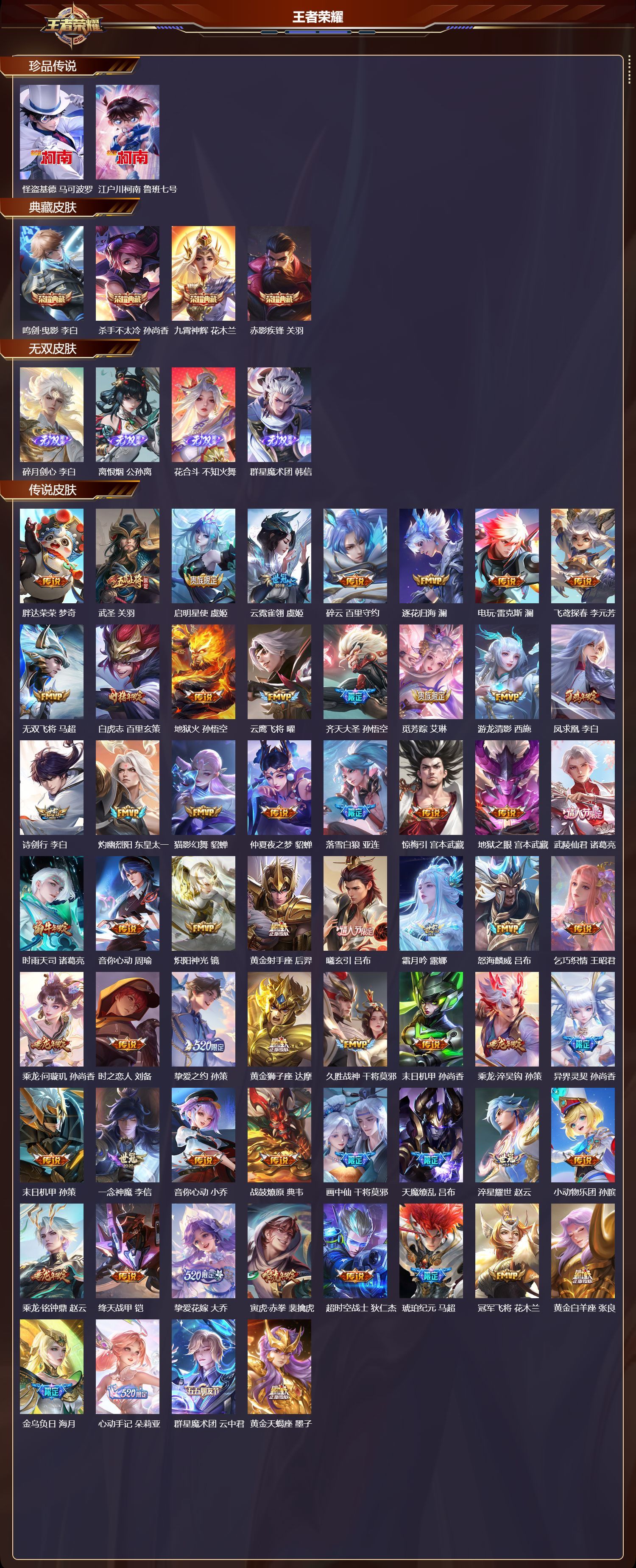 苹果QQ/荣耀王者/432皮肤/127英雄/4典藏/0珍品无双/4无双/2珍品传说/62传说/139