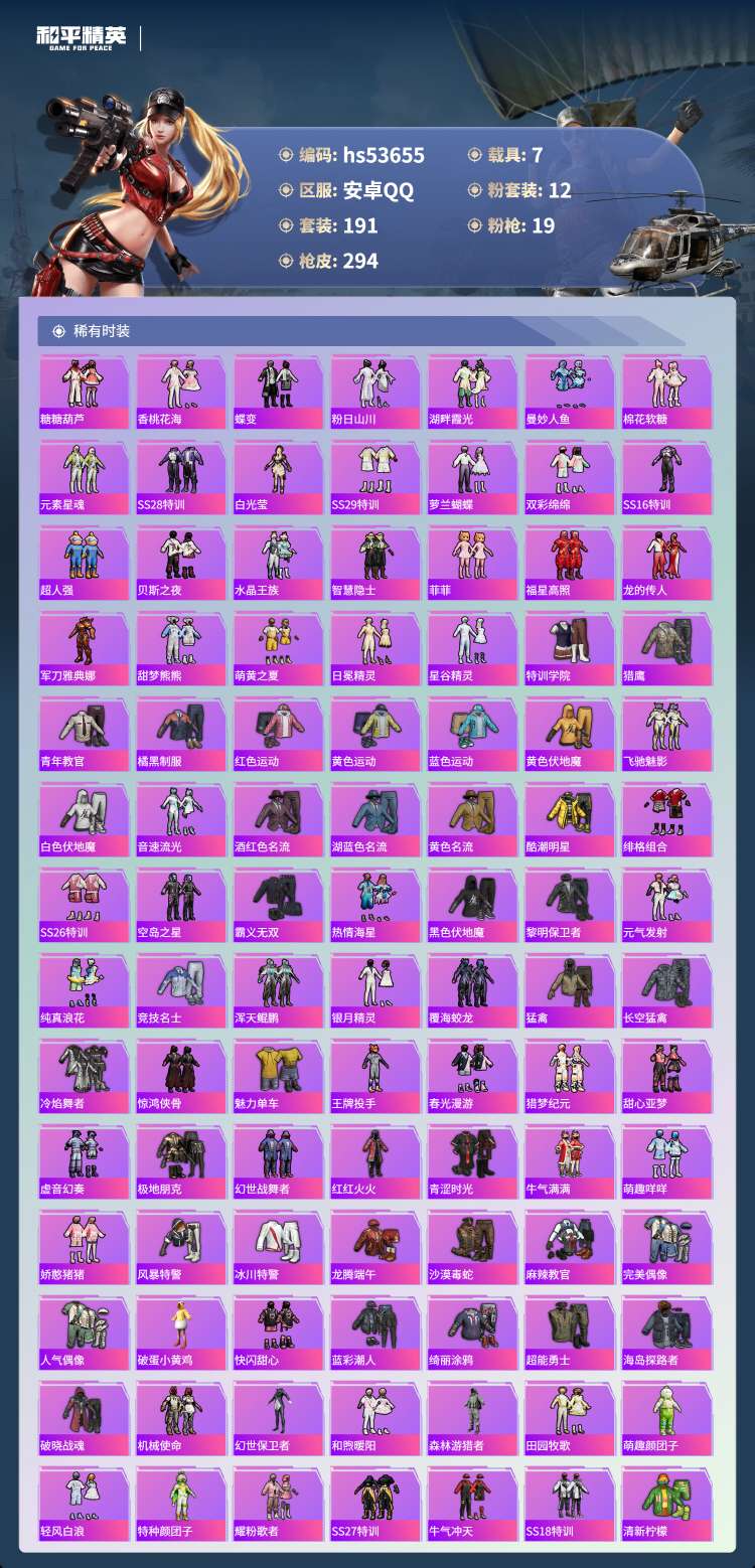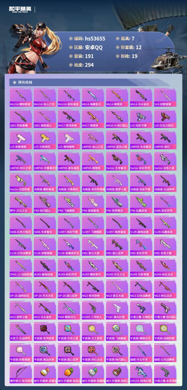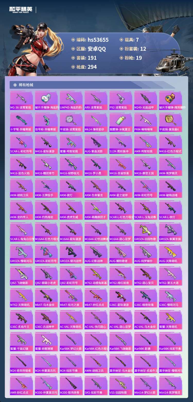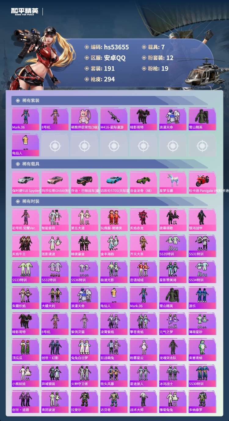 hs53655 安卓手Q-8王牌印记-12粉装-19特效枪-7载具-103174热力值-191套装-