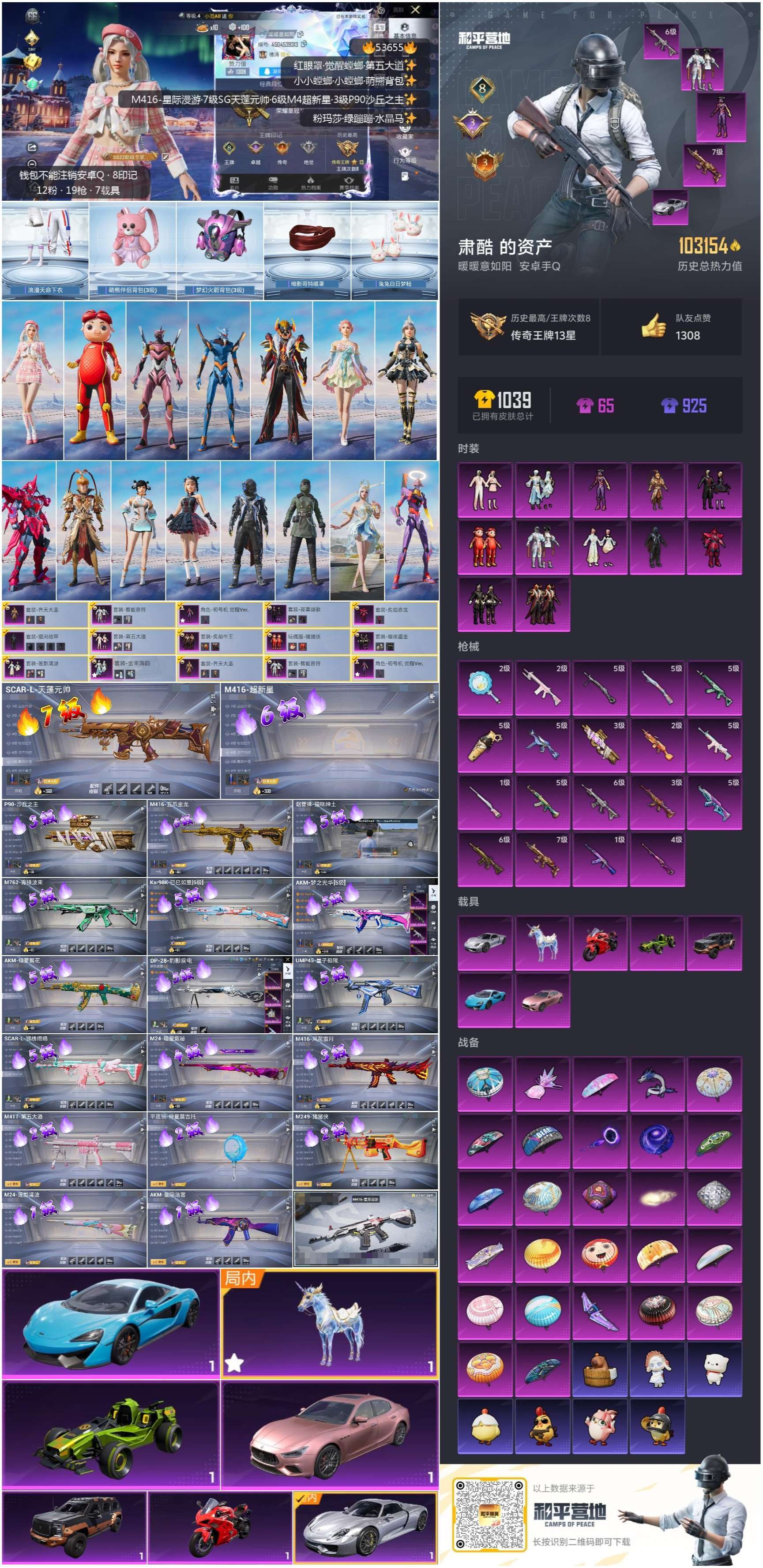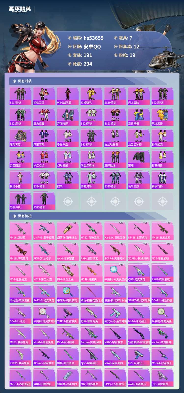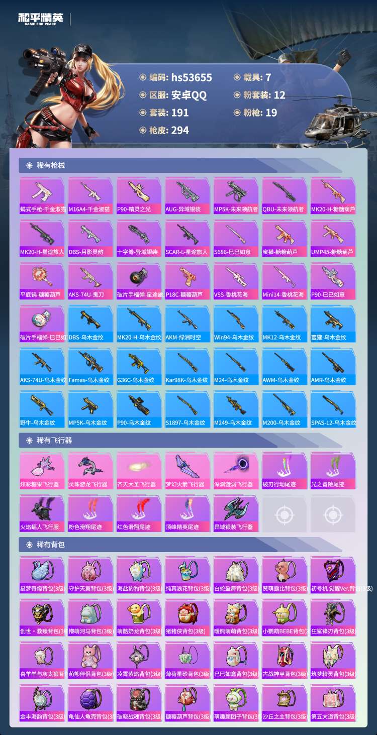 hs53655 安卓手Q-8王牌印记-12粉装-19特效枪-7载具-103174热力值-191套装-