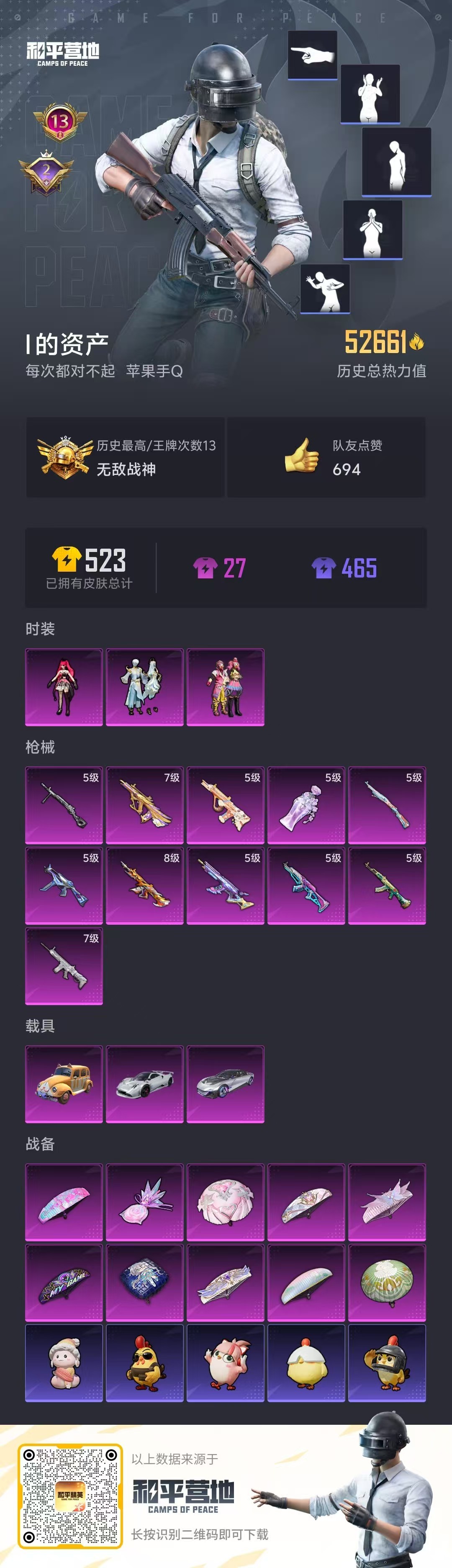 hs53659 苹果手Q-13王牌印记-有战神框-3粉装-11特效枪-3载具-52661热力值-91