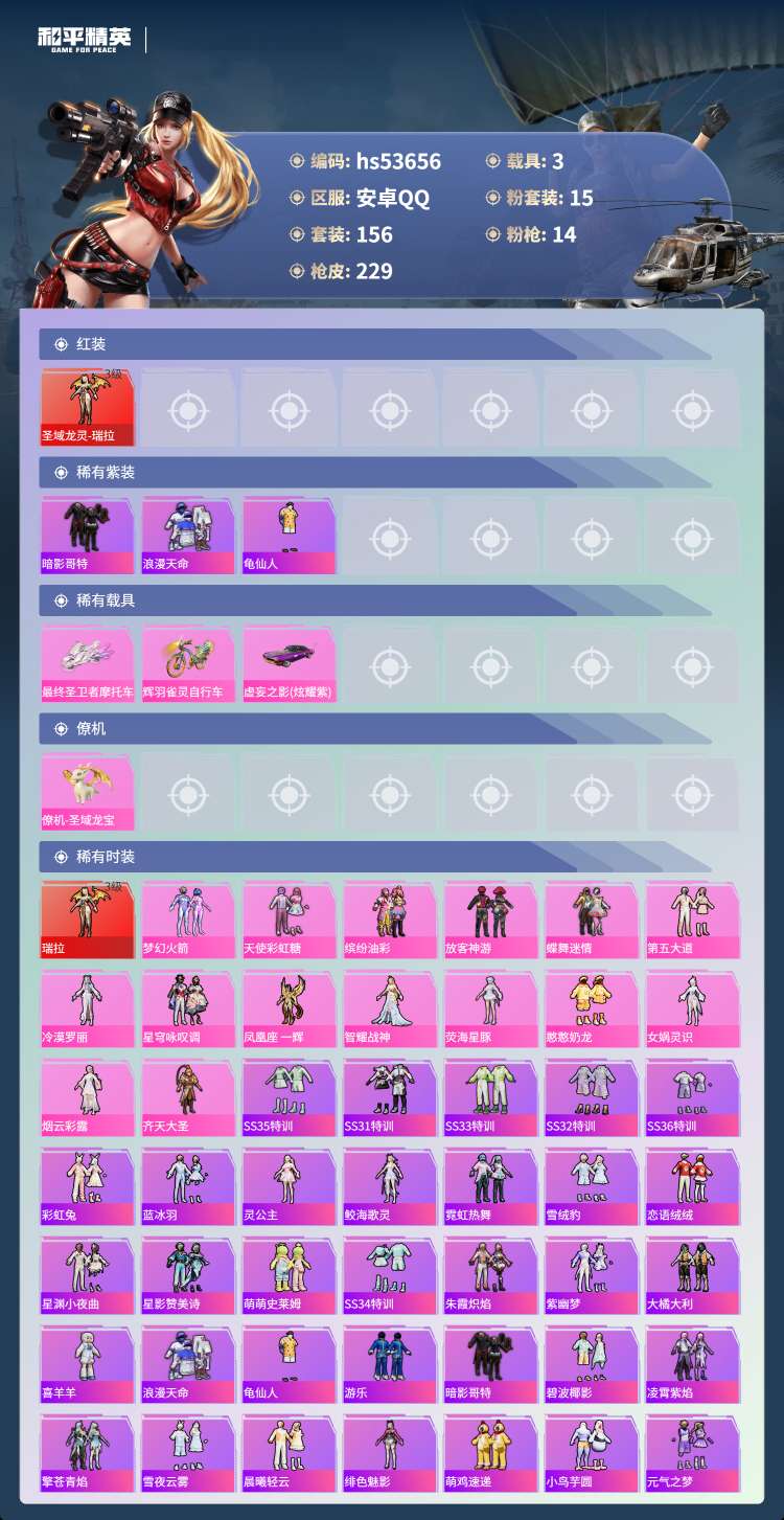 8王牌印记-1红装-15粉装-14特效枪-3载具-80904热力值-156套装-229枪皮-4卓越
