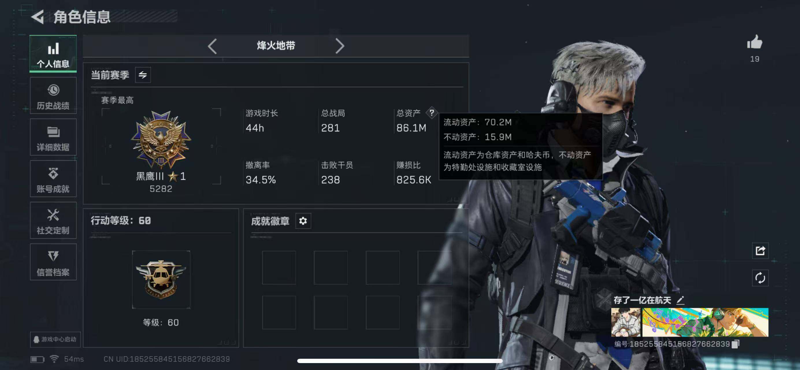 【SJ626】行动等级:60 总资产:85M 哈夫币:110.9W 近战武器:
