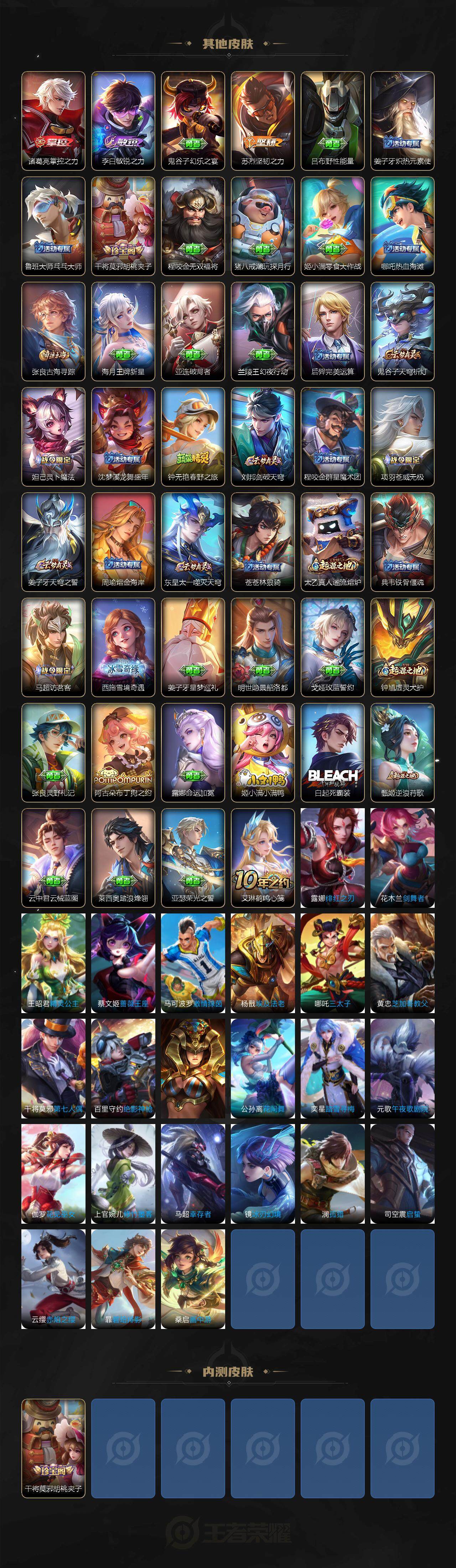 【限定皮肤】:姜子牙天穹之誓,狄仁杰阴阳师,赵云皇家上将,项羽海滩派对,干将莫邪胡桃夹子,百里玄策原初追逐者,公孙离玉兔公主,云中君纤云弄巧,嫦娥拒霜