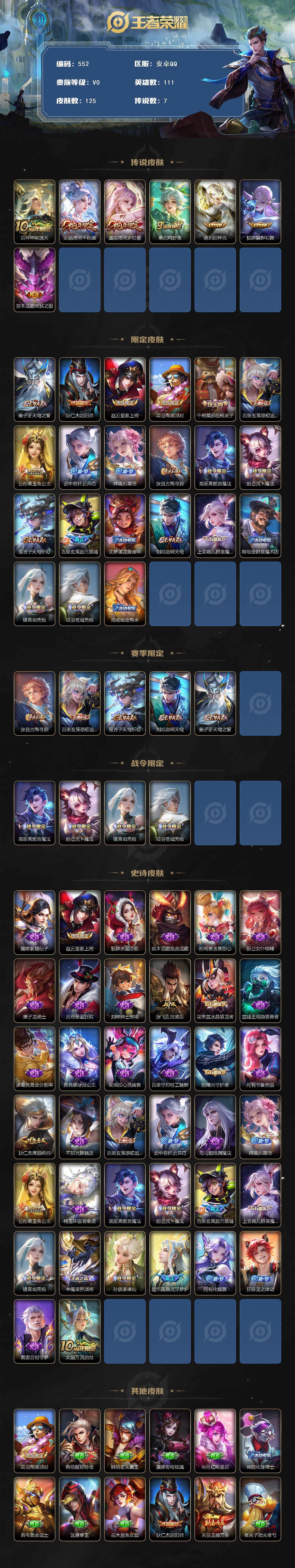 1785953 王者荣耀账号 安卓Q-V0-最强王者段位-111英雄-125皮肤-7传说-37史诗