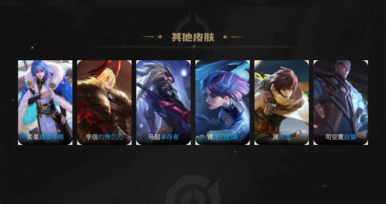 【限定皮肤】:狄仁杰阴阳师,赵云皇家上将,元歌无心,马可波罗山海玄木吟,项羽海滩派对,花木兰默契交锋,李元芳云中旅人,鬼谷子五谷丰年,梦奇顽趣,沈梦溪大漠名商,裴擒虎擒涛扼浪,嫦娥暖冬兔眠,曜山海苍雷引,鲁班大师探海日志,桑启海盐诗旅,暃