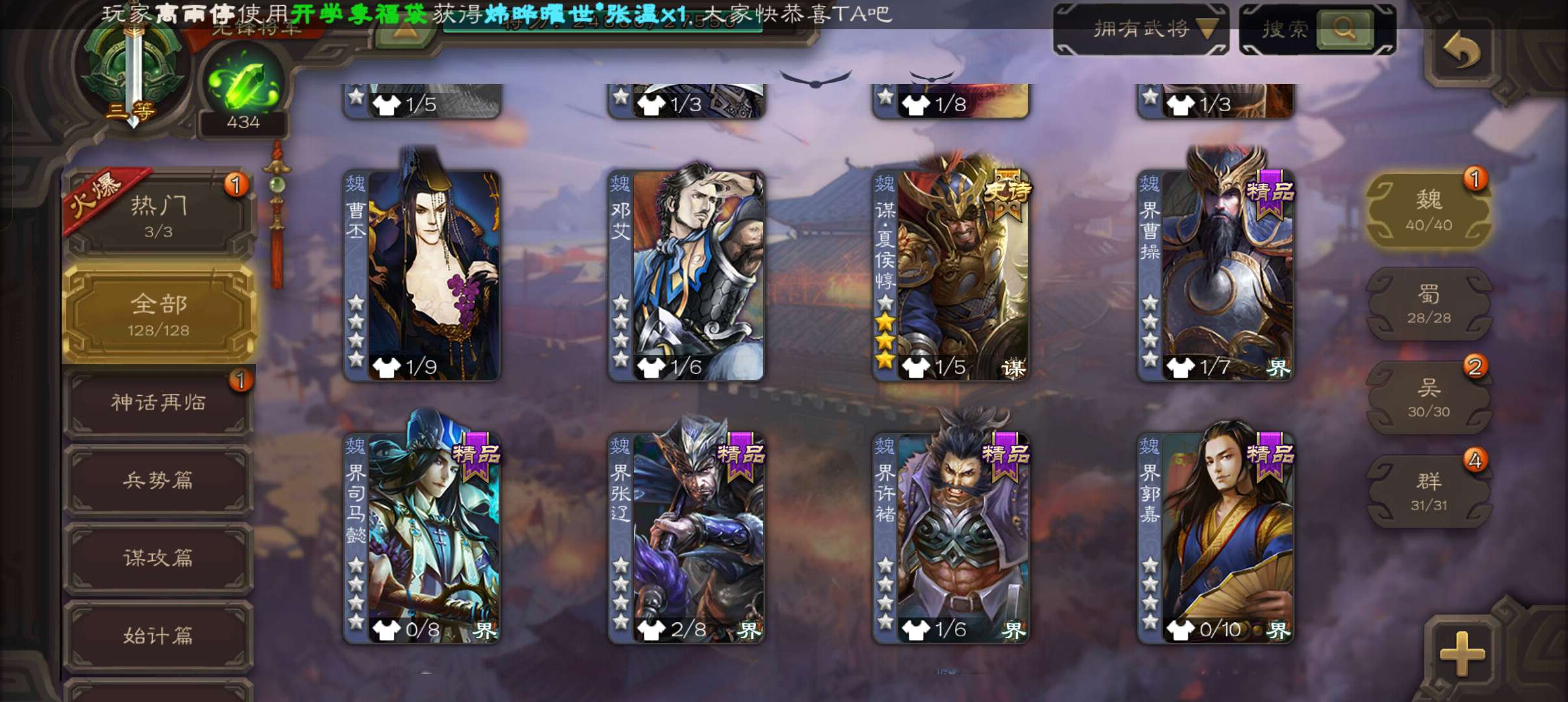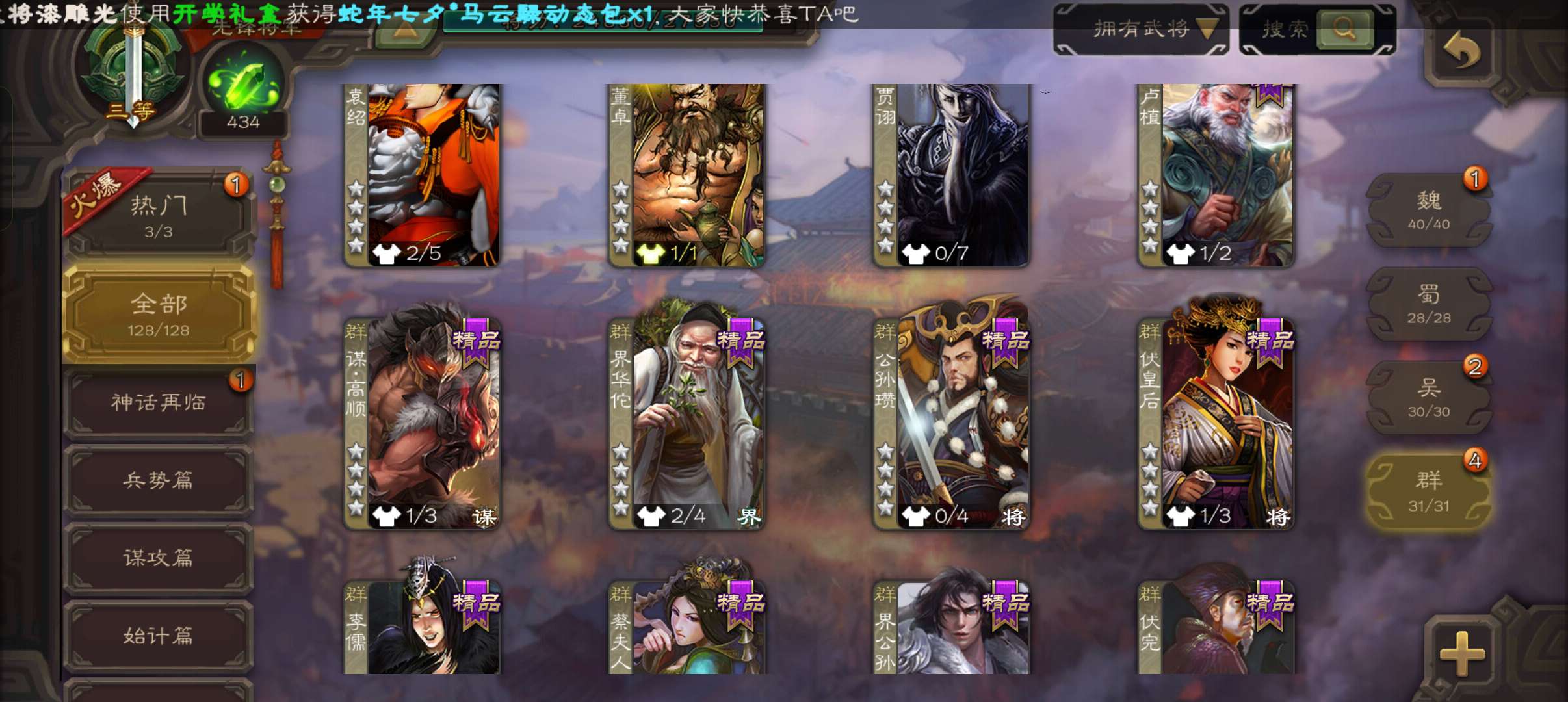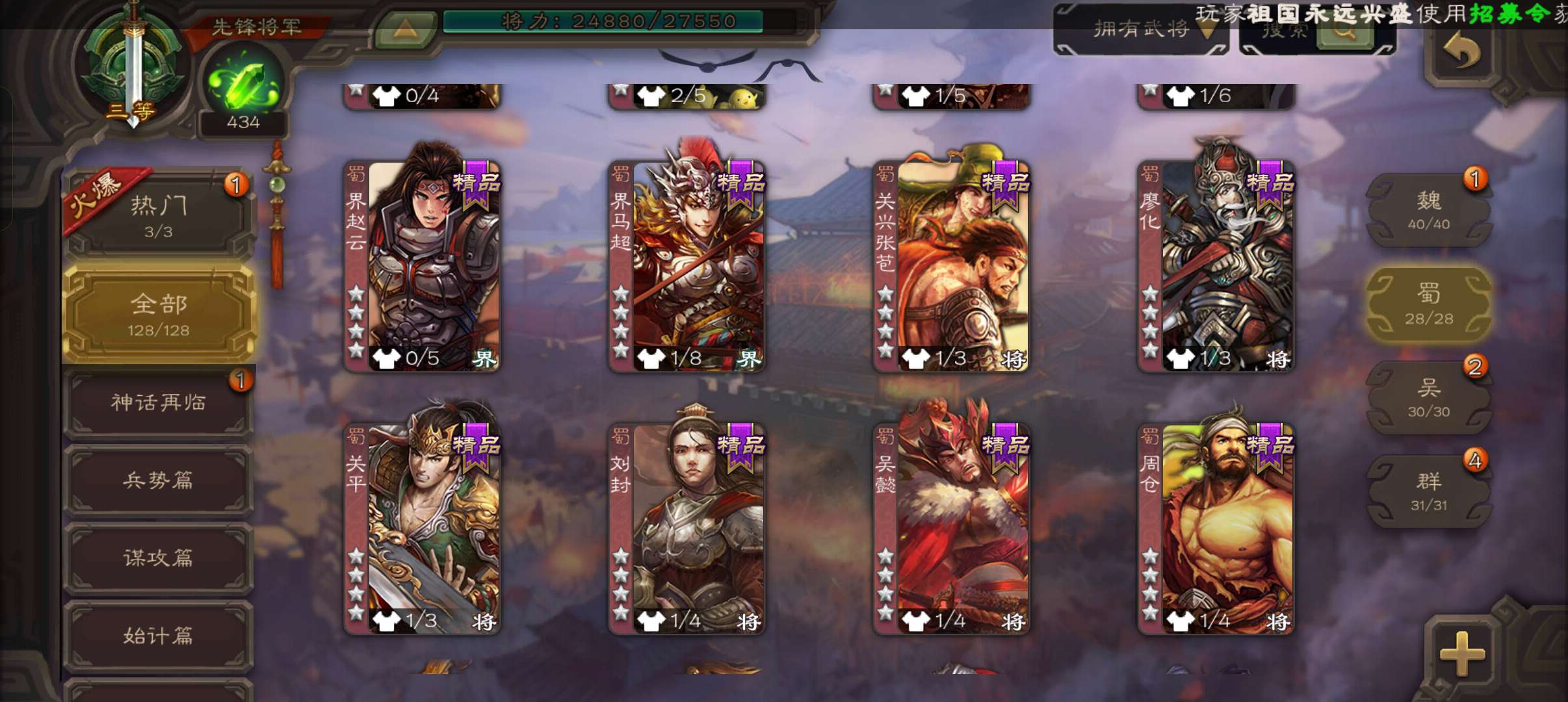 4史诗先锋,5万豆,天工孟达,回廊动白马谋夏侯惇界钟会马云騄,甘夫人谋高顺张布128将