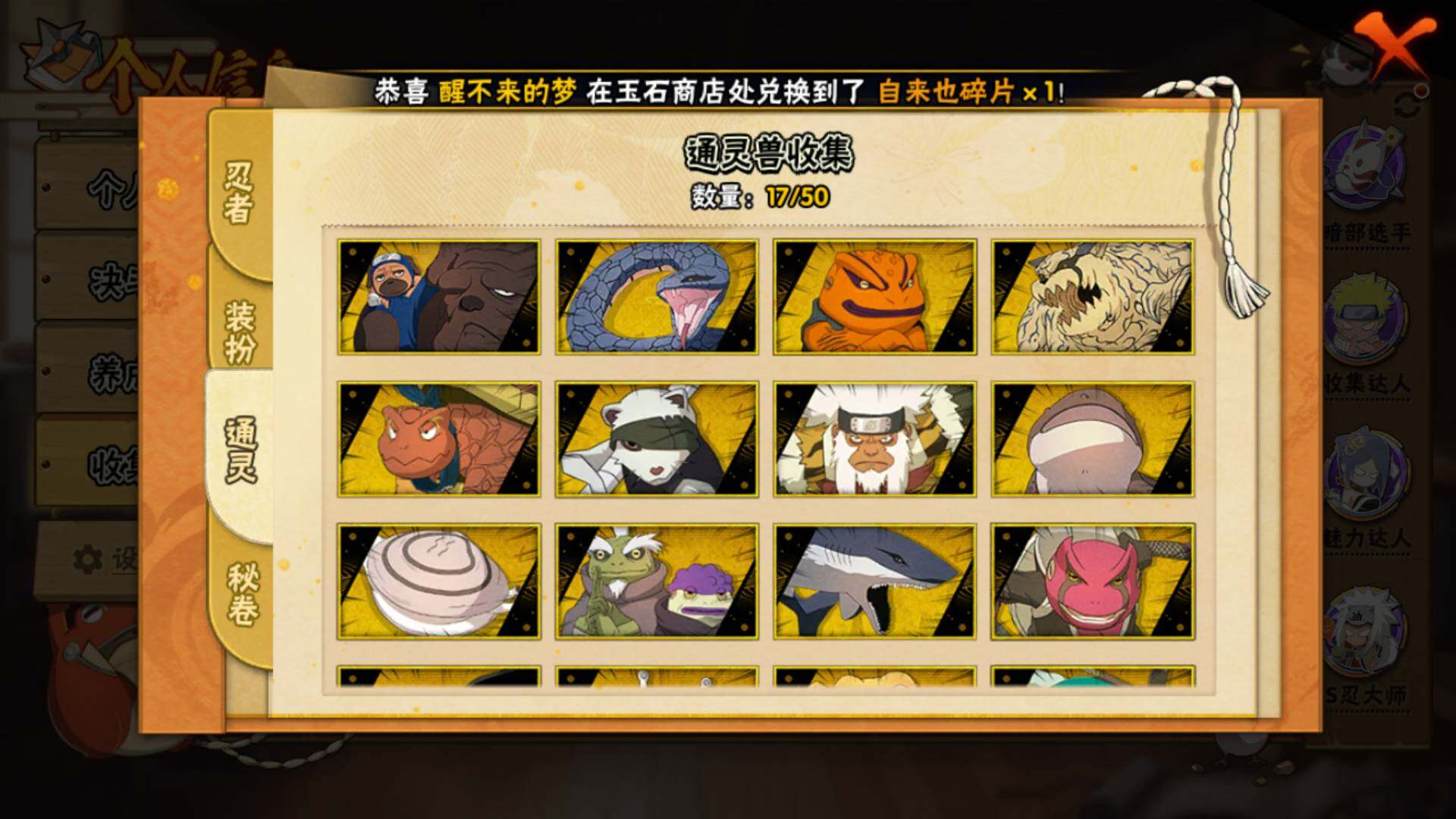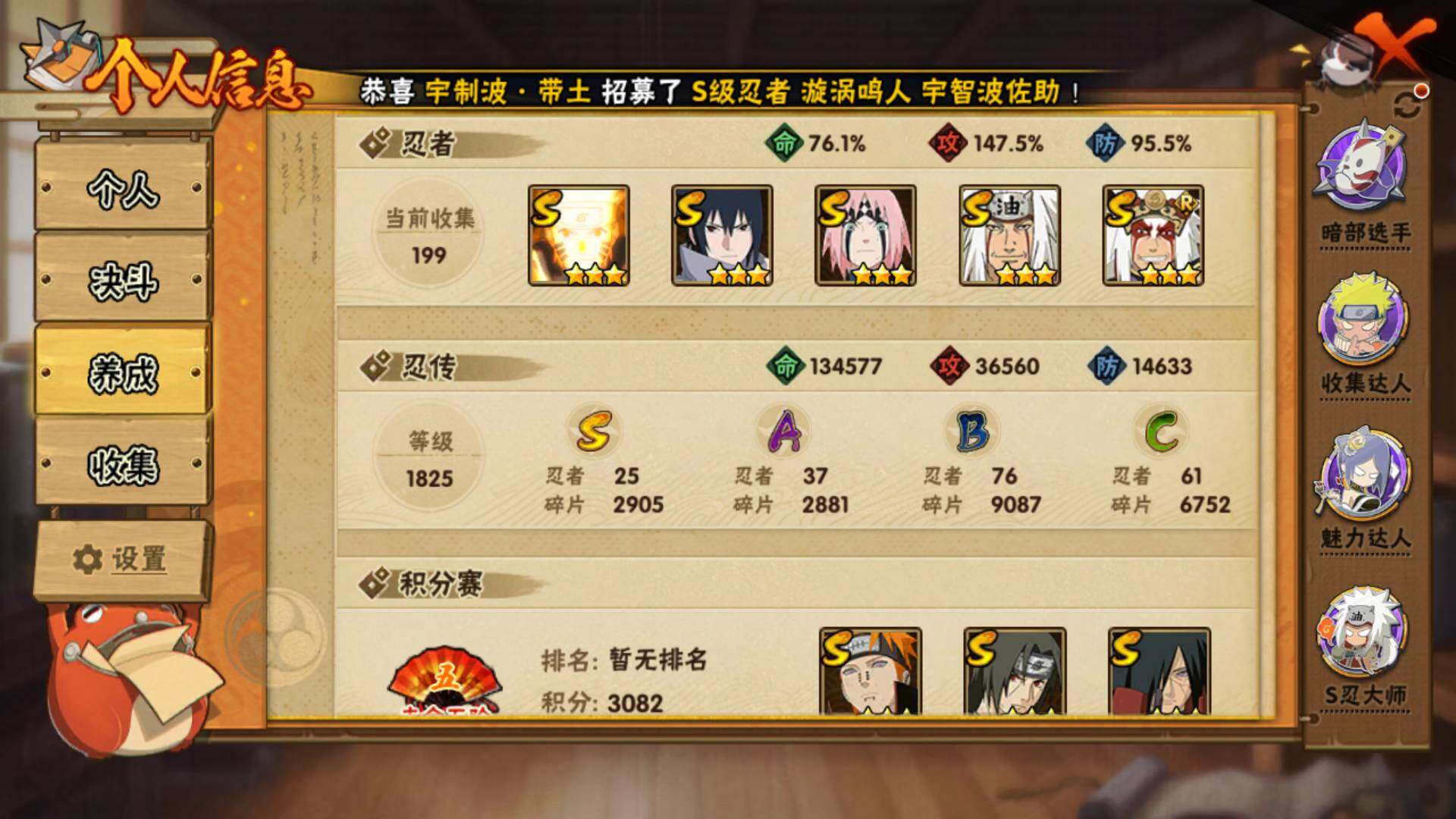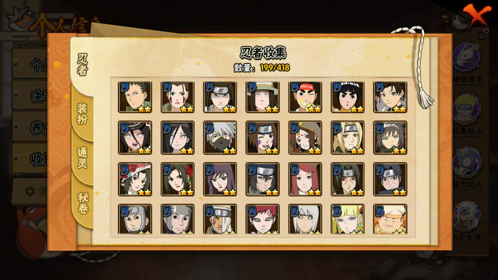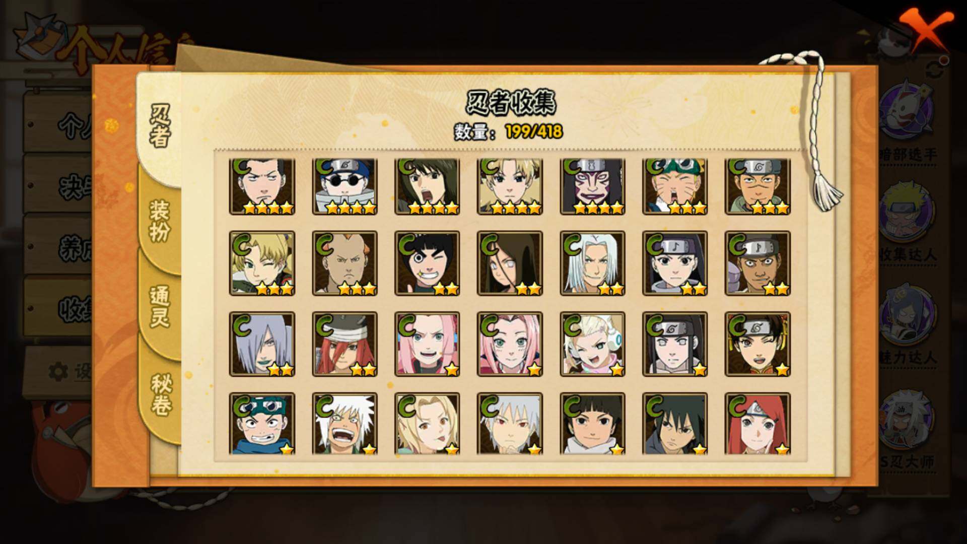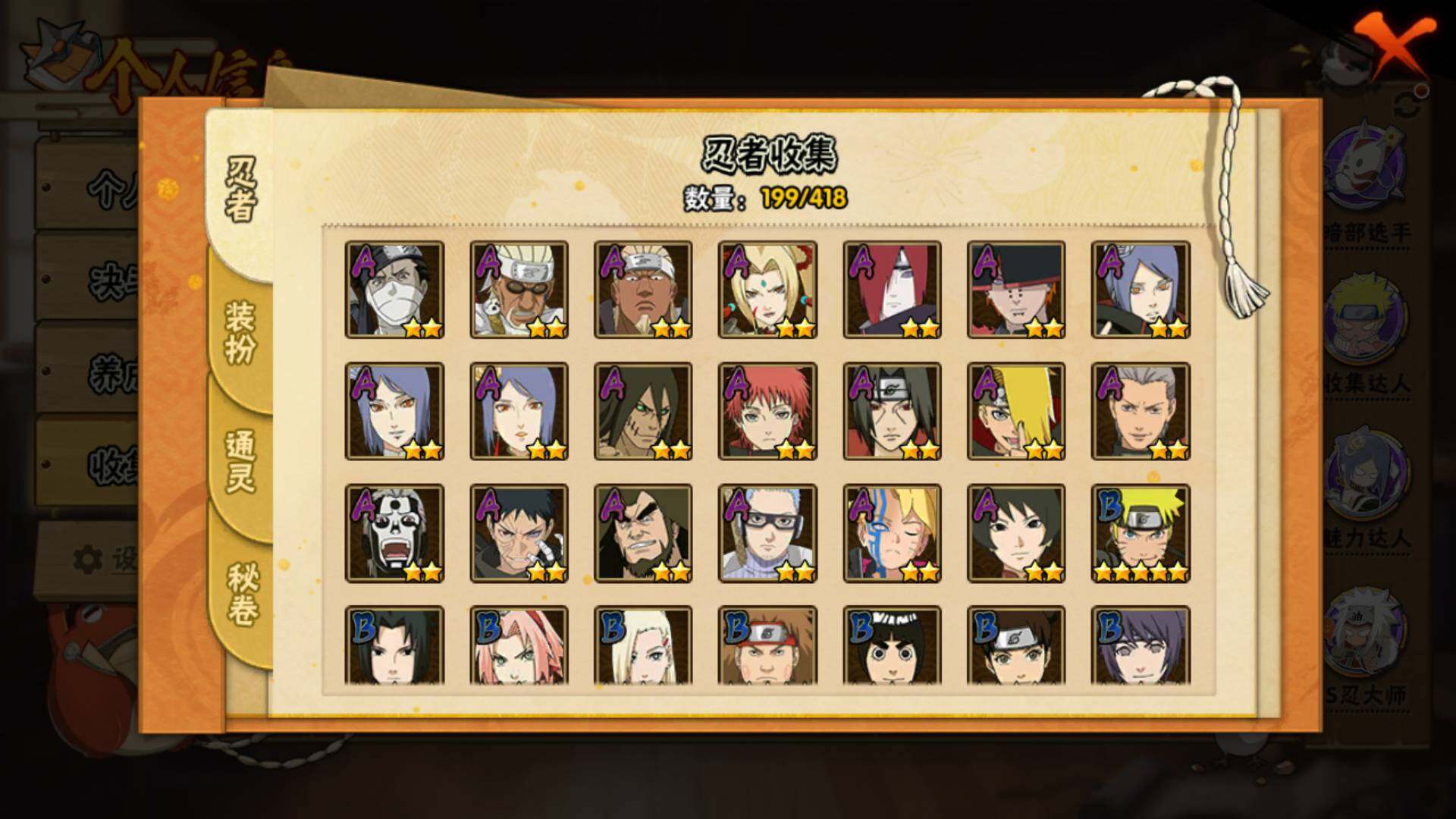 【S级忍者】:猿飞日斩「秽土转生」(3星),宇智波鼬「秽土转生」(3星),宇智波斑「秽土转生」(3星),宇智波斑「秽土转生·解」(3星),春野樱「忍界大战」(3星),宇智波带土「忍界大战」(3星),艾「忍界大战」(3星),宇智波鼬「须佐能