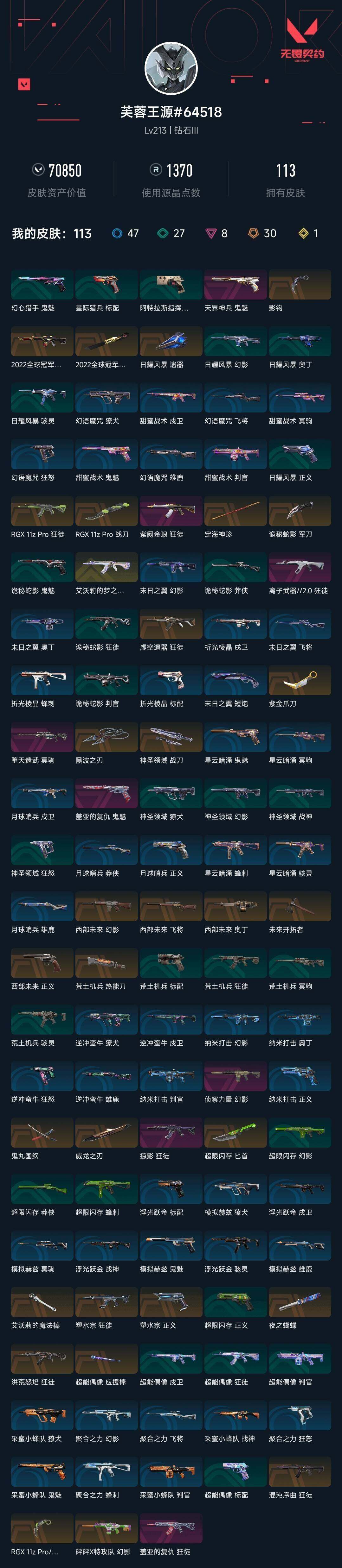 终极*30/传奇*1/卓越*8/皮肤*113/等级*213