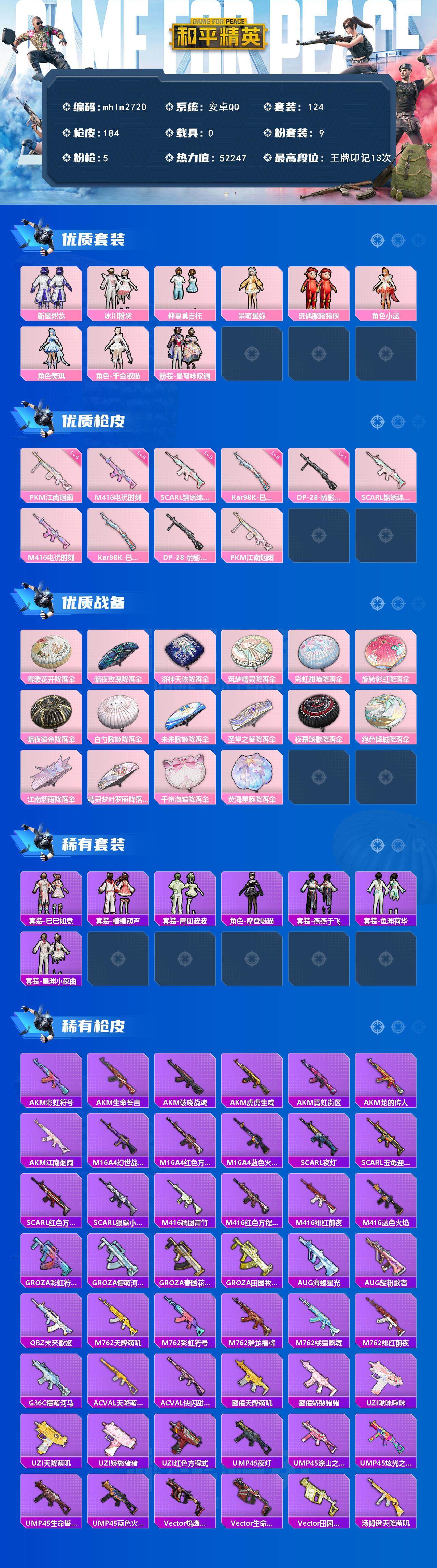 【mhlm2720】安卓 手Q-9粉装-5特效枪-0载具-0粉色飞行器-52247热力值-13王牌印记-124套装-184枪皮