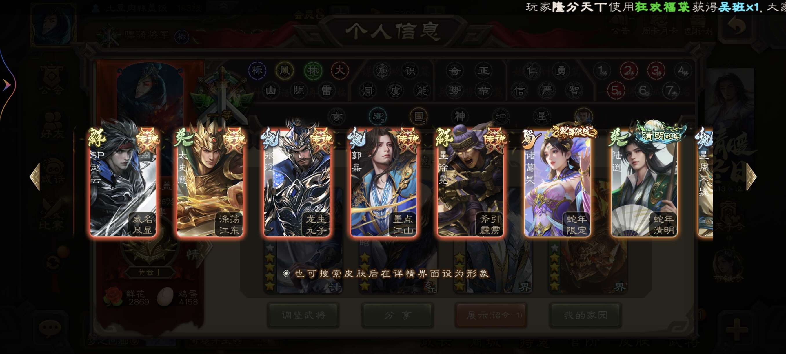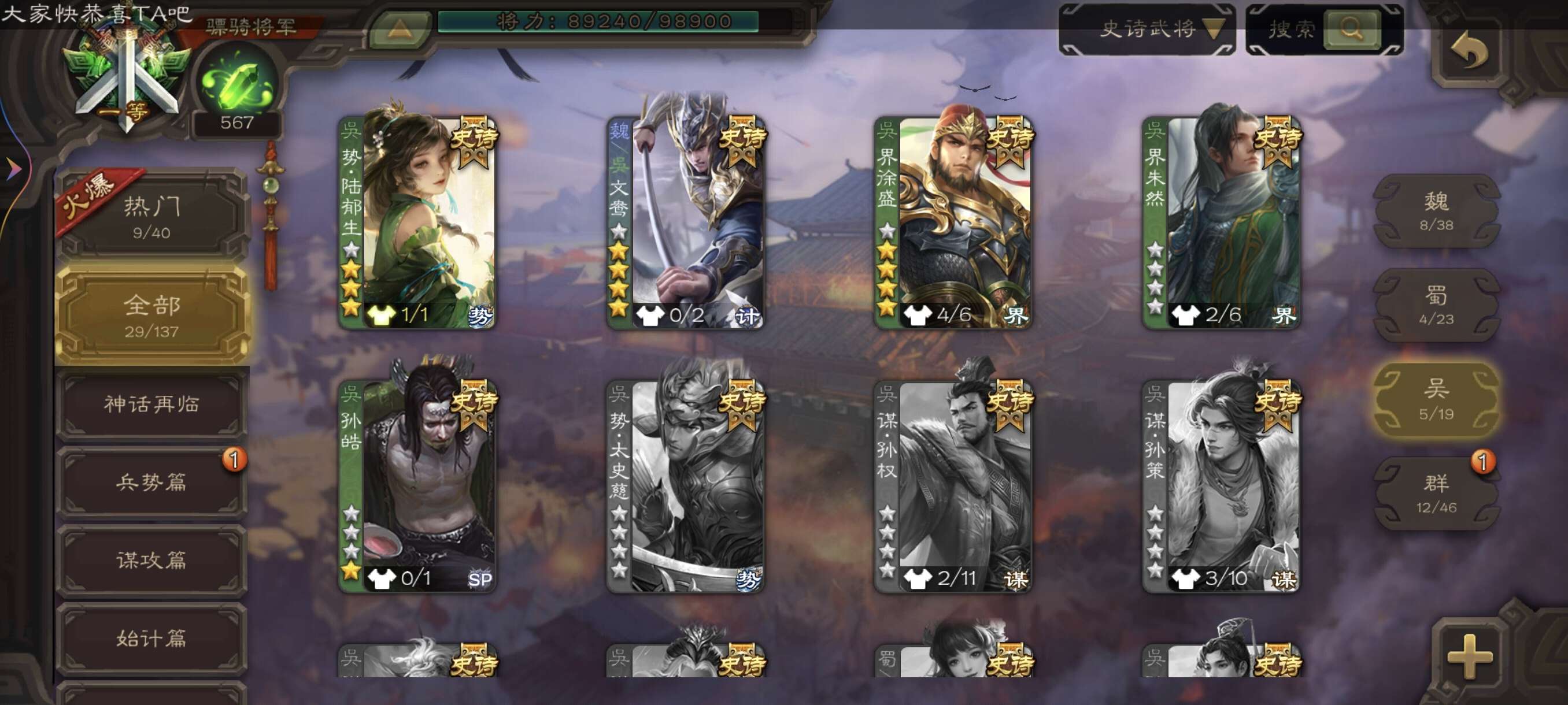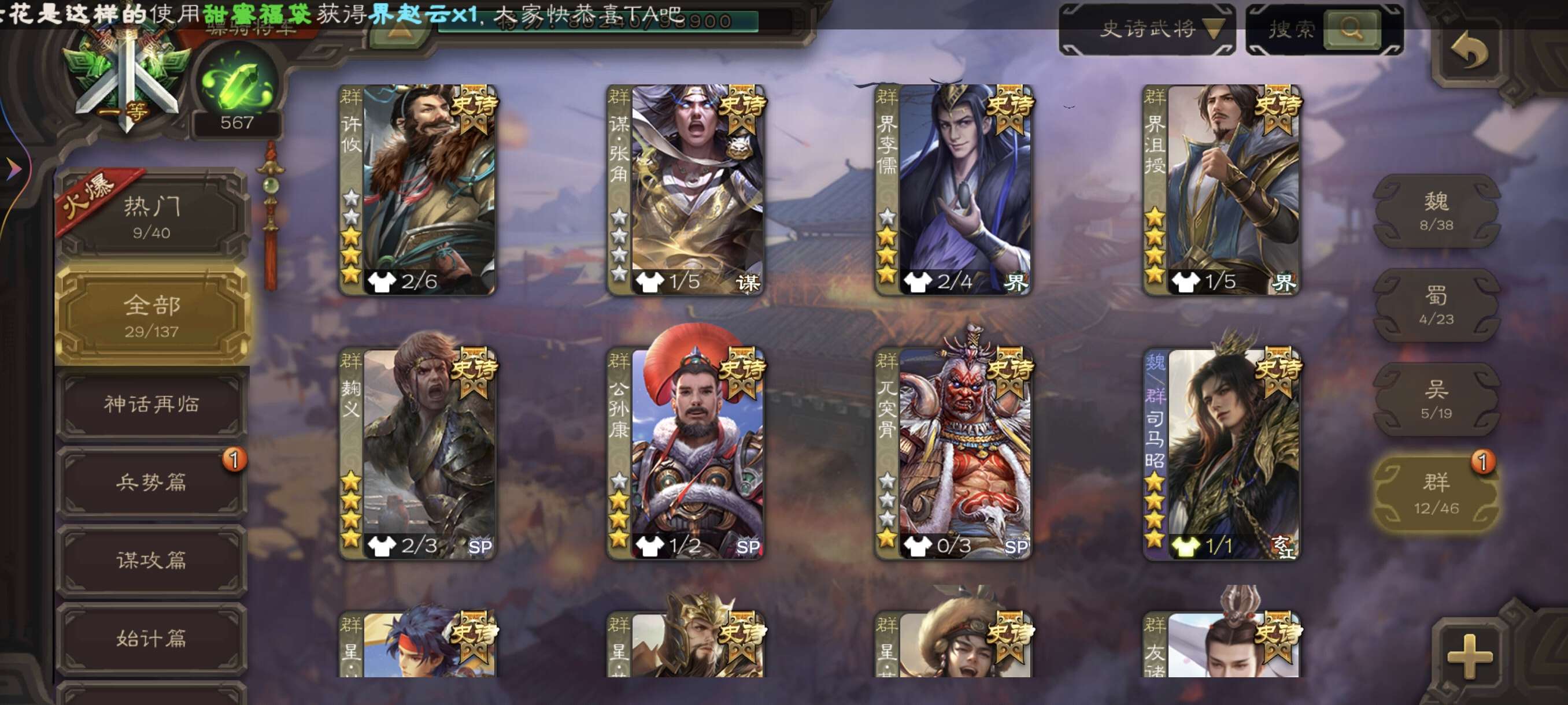 稀有双权一,友诸葛加界沮授,文鸯,大宝,还有超多史诗,气卡豆子很多,还剩了20多宝珠,退游卖号了