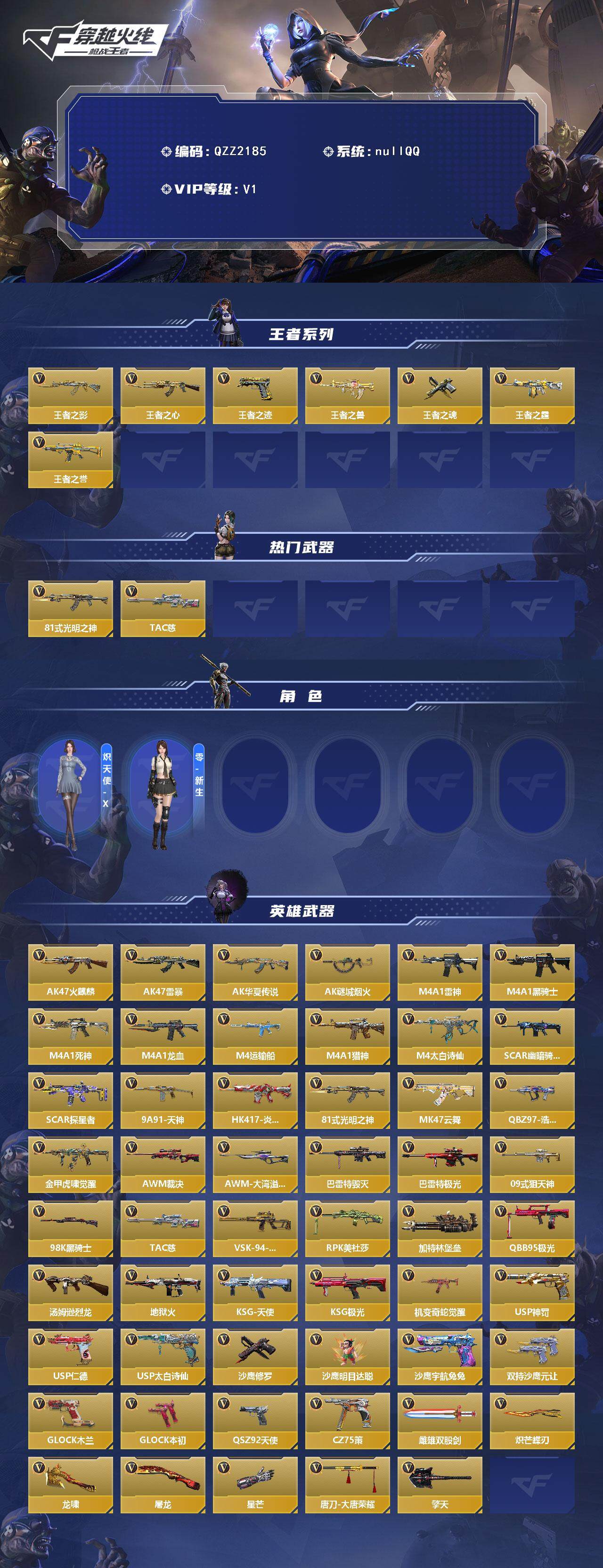 【QZZ2185】VIP1/189V/王者之影/王者之心/王者之迹/王者之兽/王者之魂/王者之霆/王者之誉/81式-光明之神/TAC-慈/炽天使-X/零-新生/AK47-火麒麟/AK47-雷暴/AK47-华夏传说/AK47-谜城烟火/M4A1-雷神/M4A1-黑骑士/M4A1-死神/M4A1-龙血/M4A1-运输船/M4A1-猎神/M4A1-太白诗仙/SCAR-幽暗骑士/SCAR-探星者/9A91-天神/HK417-炎龙铠甲/MK47-云舞/QBZ97-浩瀚征途/QBZ191-金甲虎啸觉醒/AW