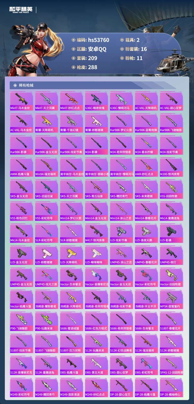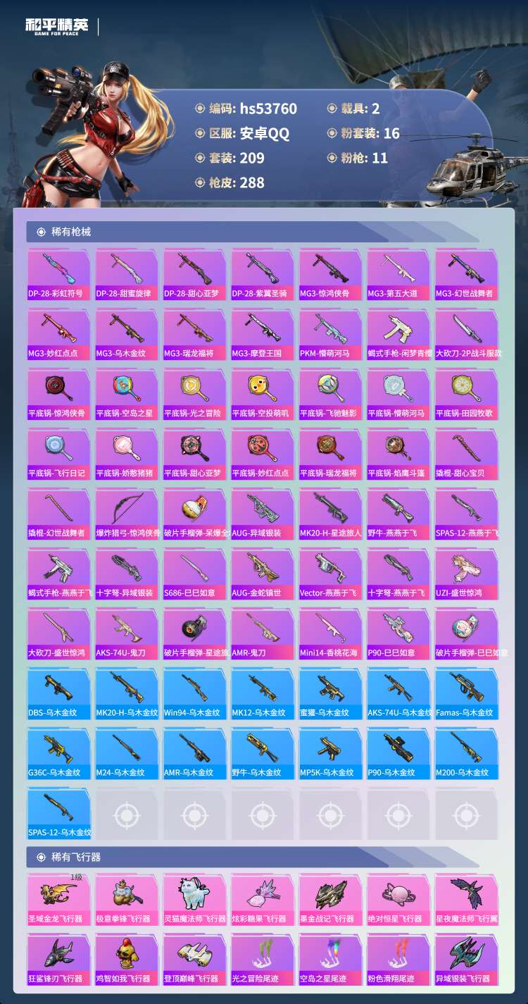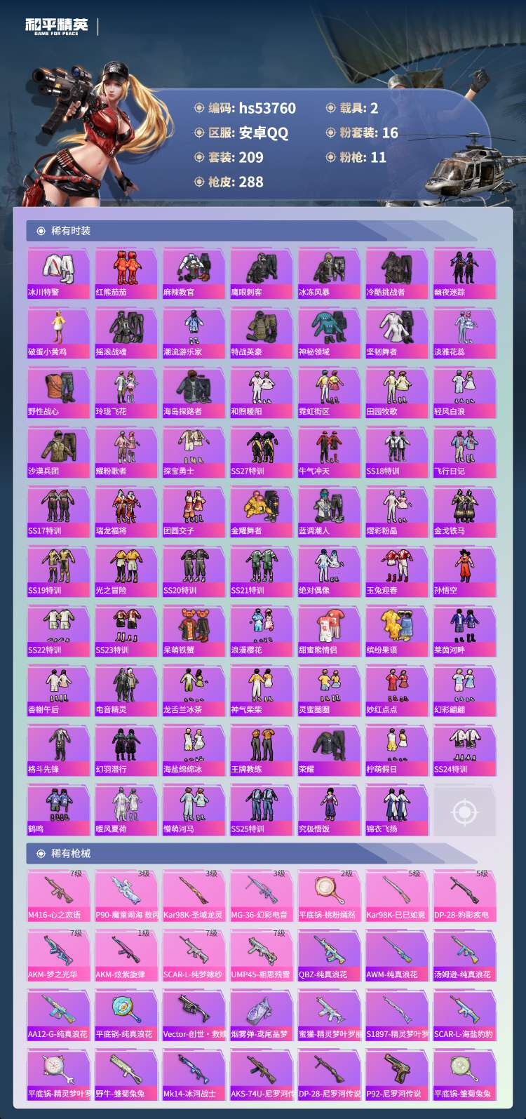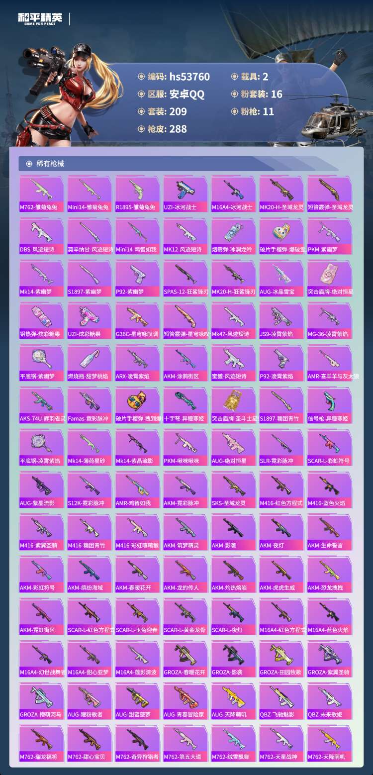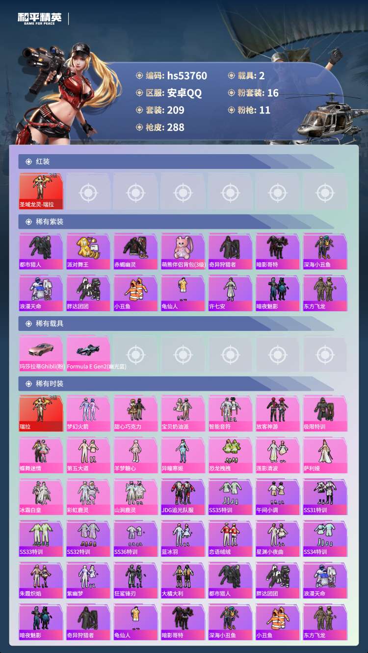17王牌印记-1红装-16粉装-11特效枪-2载具-105643热力值-209套装-288枪皮-5卓