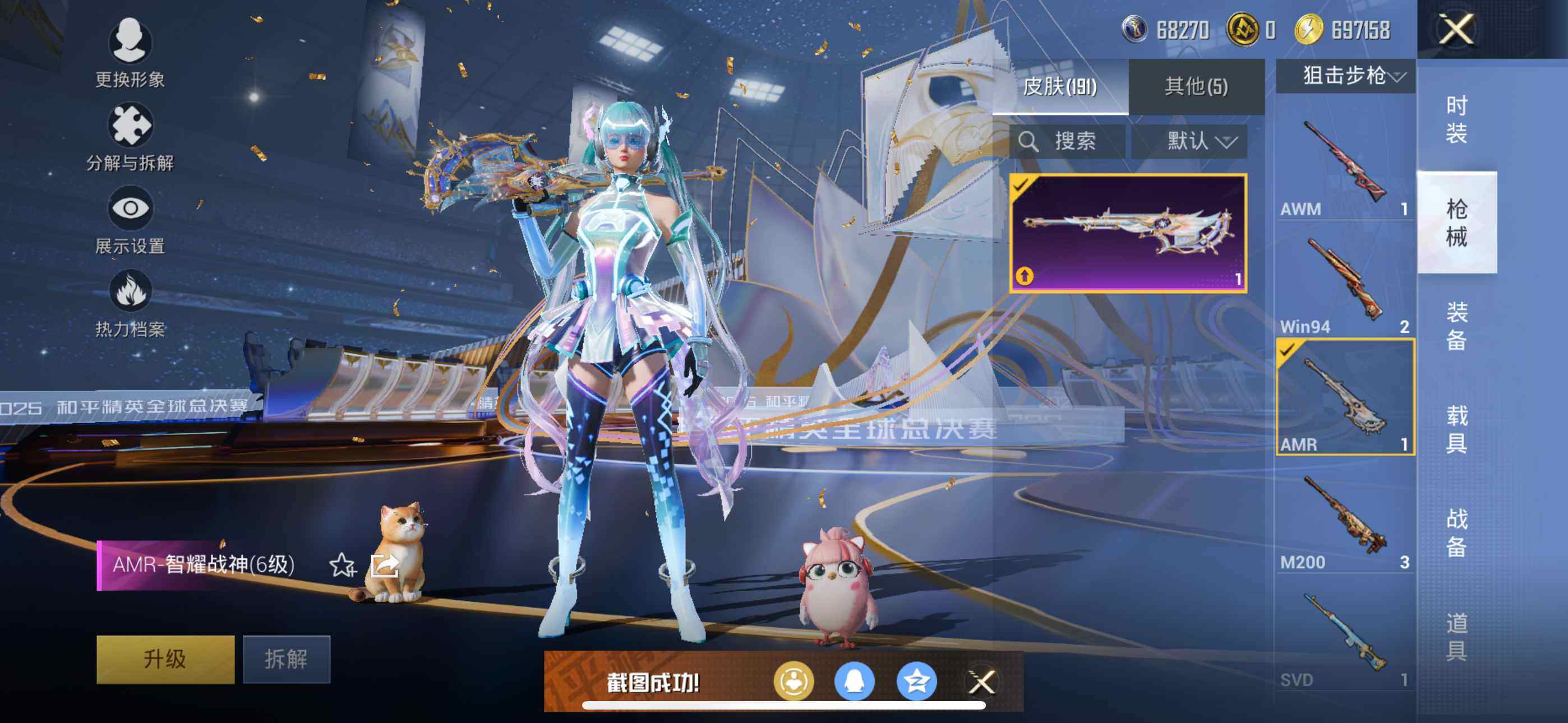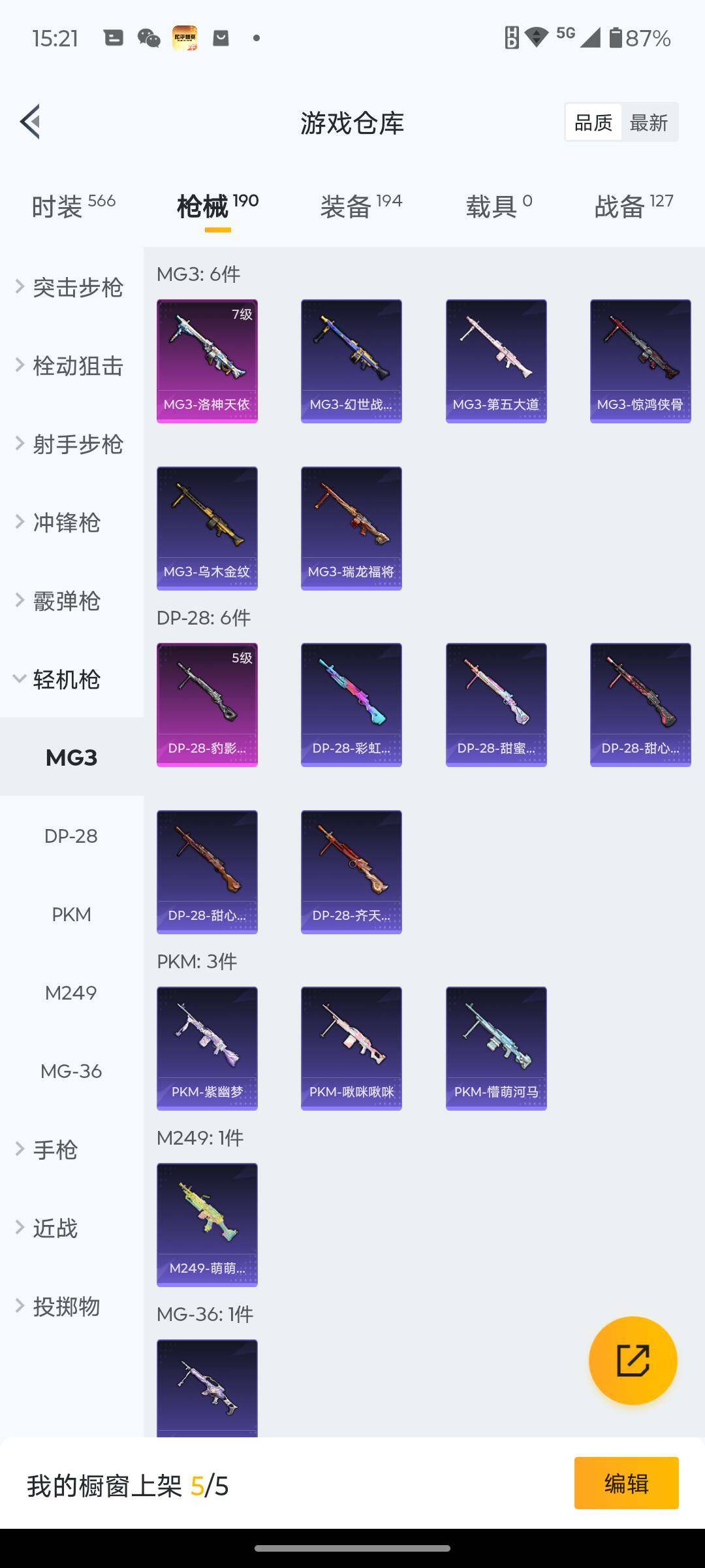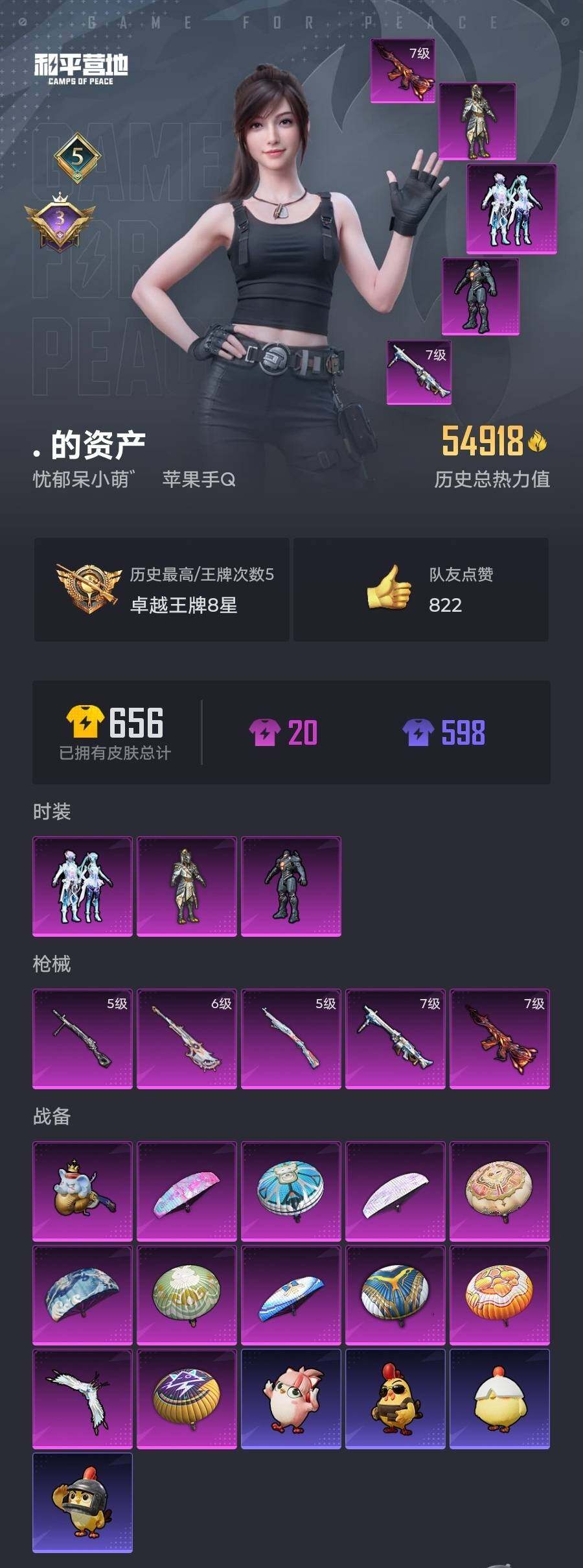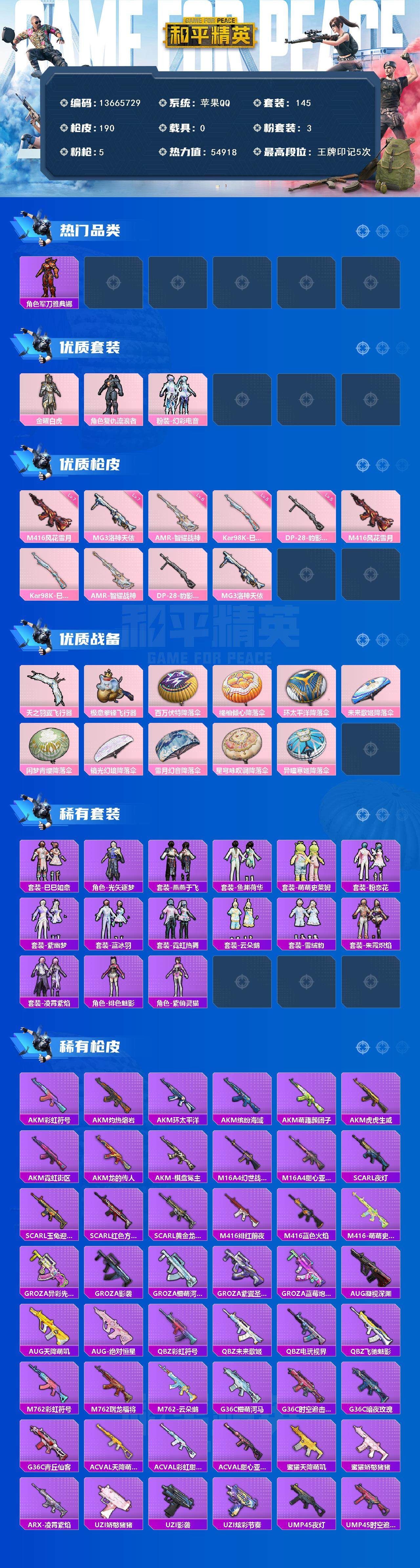 145套装/枪械5/装备194/战备127/王牌印记5/热力值54918/七级M416-风花雪月/五级Kar98K-巳巳如意/六级AMR-智耀战神/五级DP-28-豹影疾电/七级MG3-洛神天依/军刀雅典娜/套装-粉红小猪/金曜白虎/复仇流浪者/粉装-幻彩电音/M416-风花雪月/Kar98K-巳巳如意/AMR-智耀战神/DP-28-豹影疾电/MG3-洛神天依/天之羽翼飞行器/极意拳锋飞行器/百