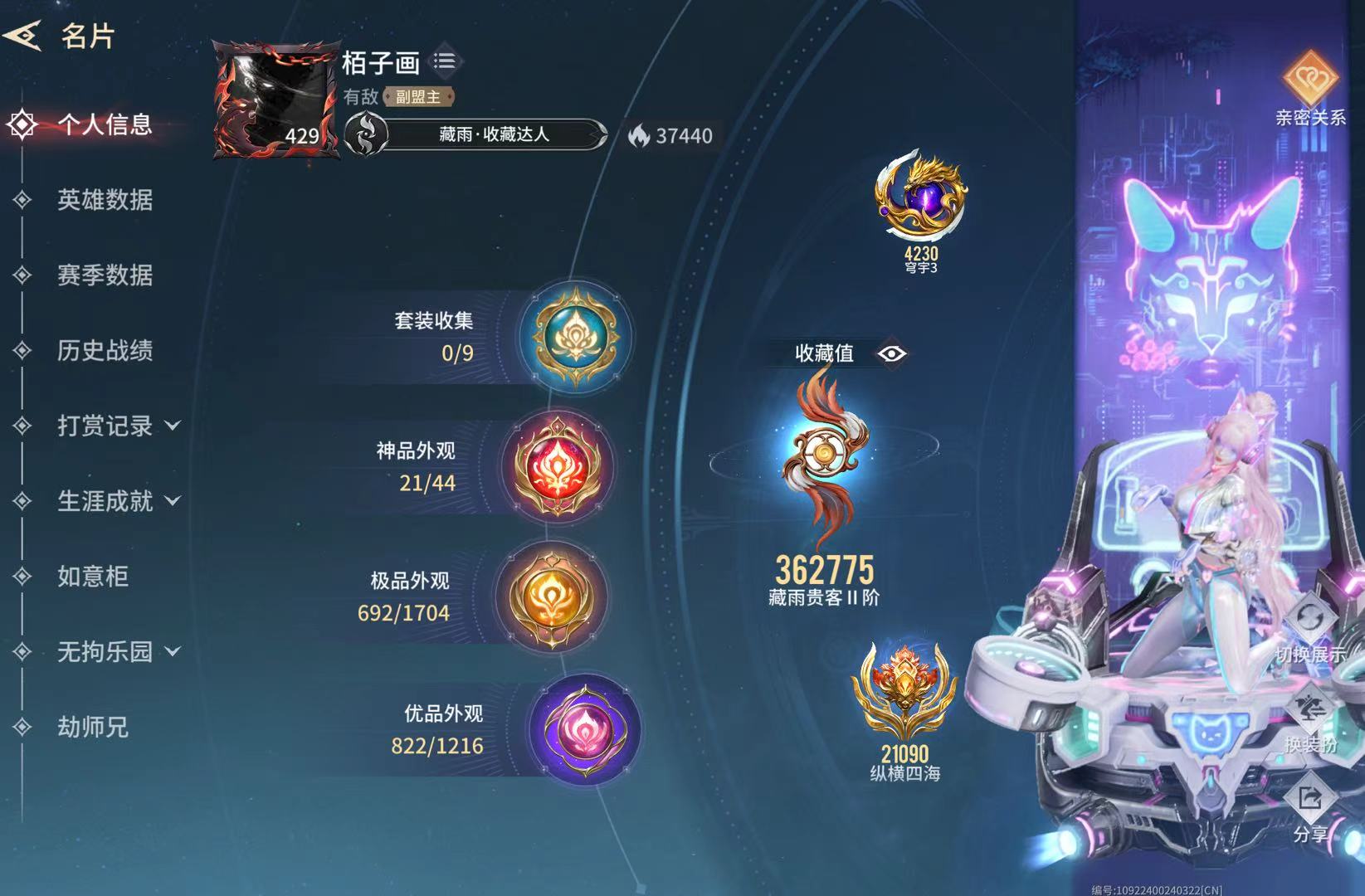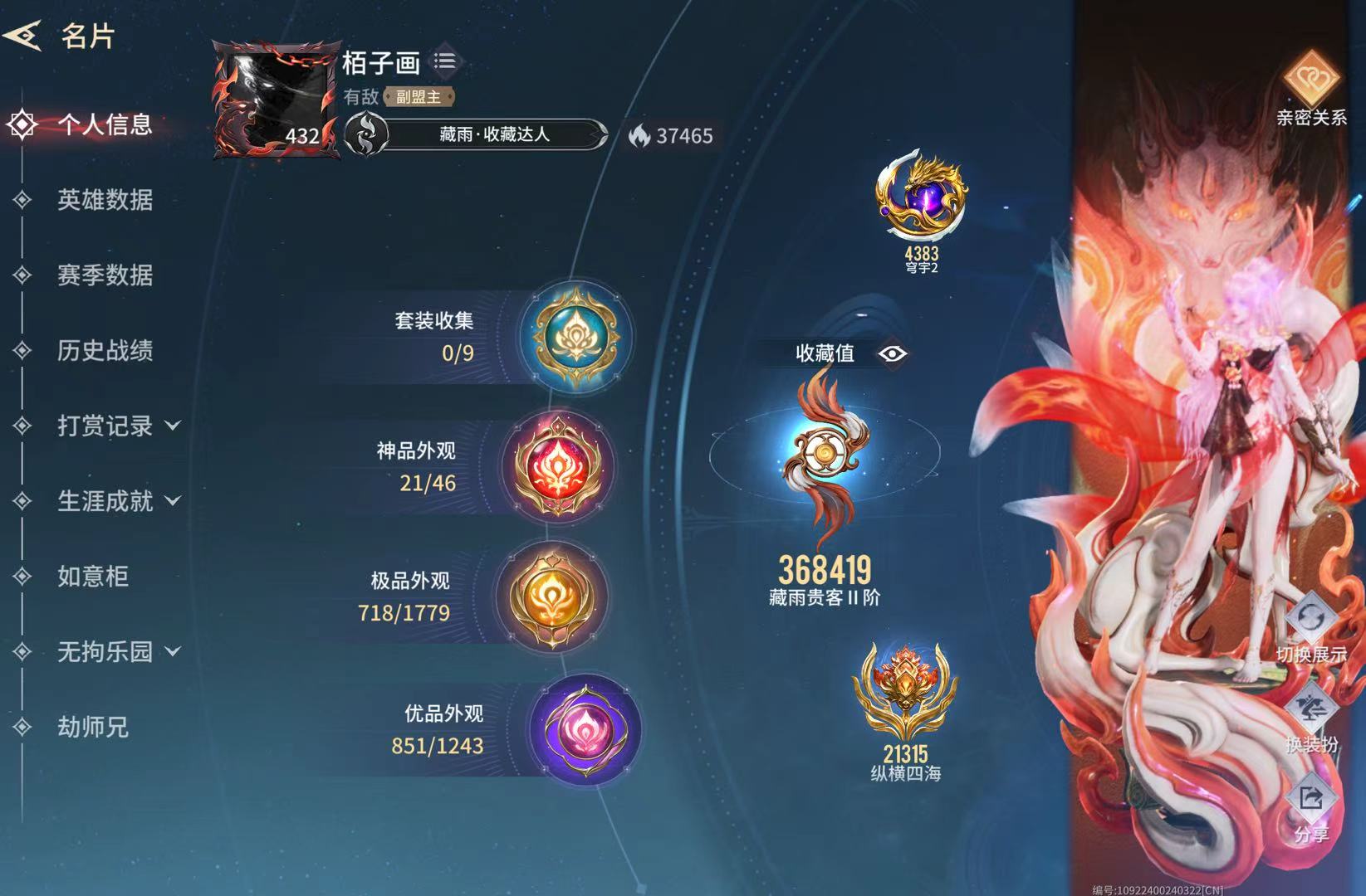 37万收藏值武器除横刀和双刀飞刀没红皮其他全满,衣服除无尘李寻欢希腊季莹莹没红皮其他每个英雄均有皮肤