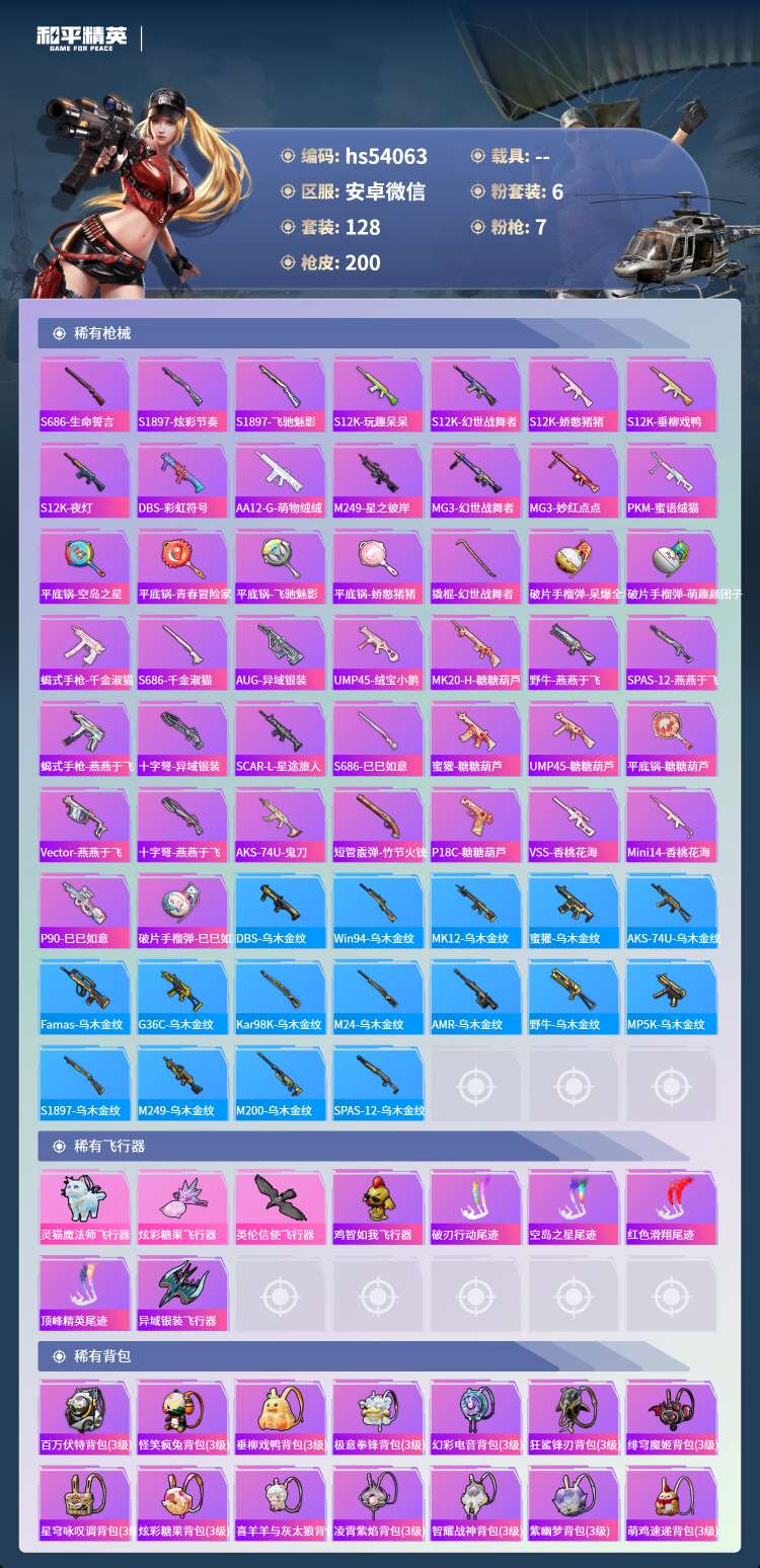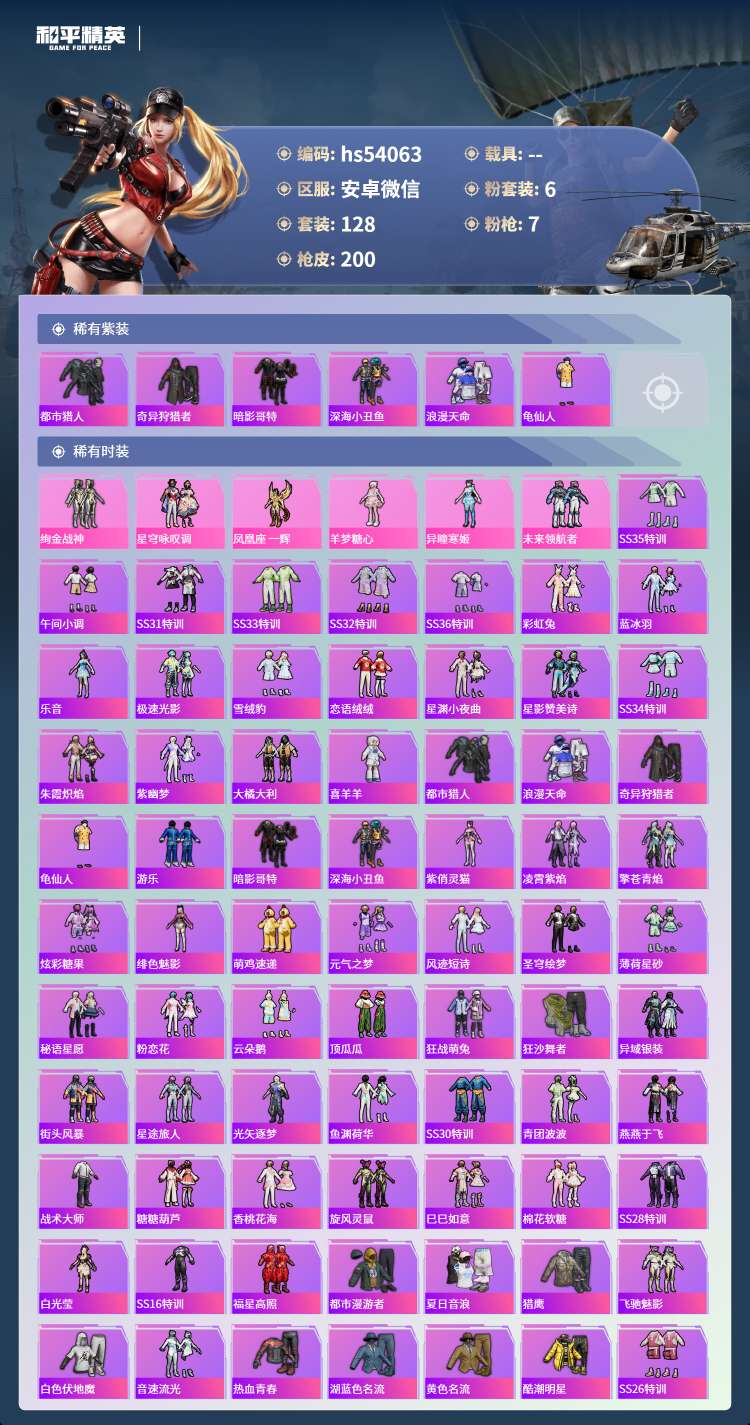 hs54063 安卓微-16王牌印记-6粉装-7特效枪-63405热力值-128套装-200枪皮-