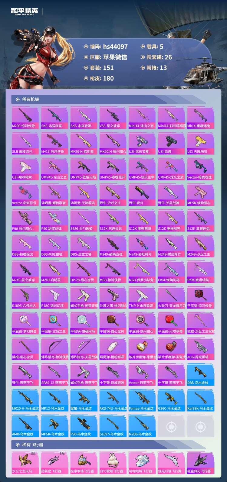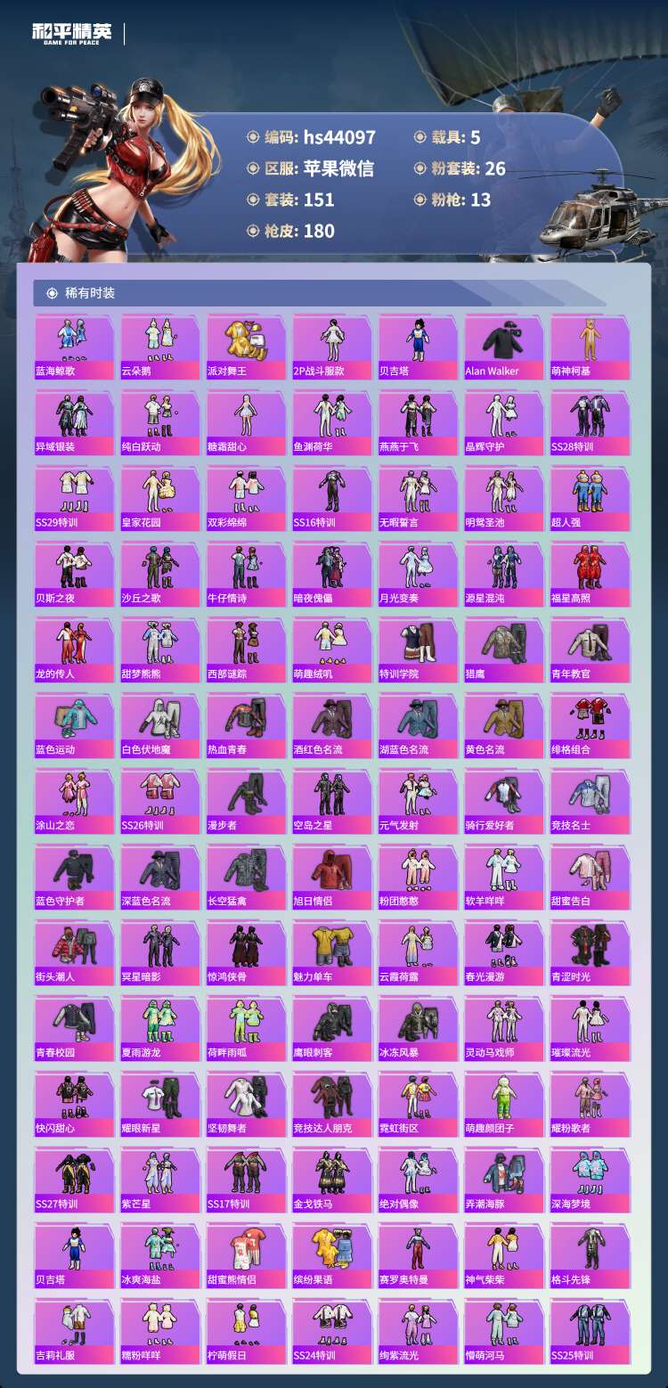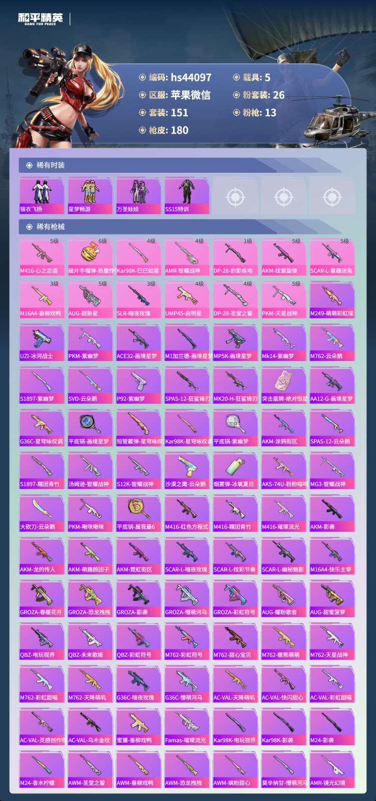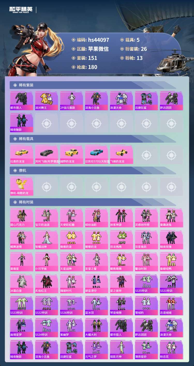 hs44097 苹果微-7王牌印记-26粉装-13特效枪-5载具-78034热力值-151套装-1