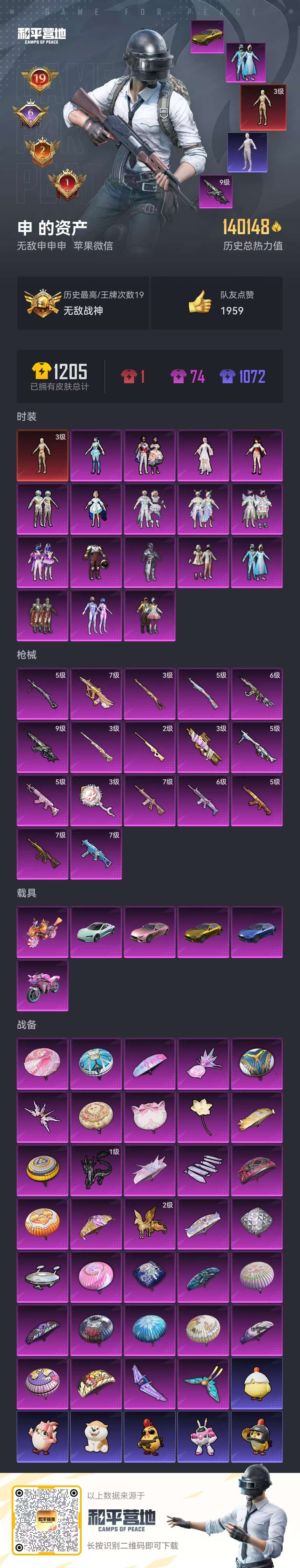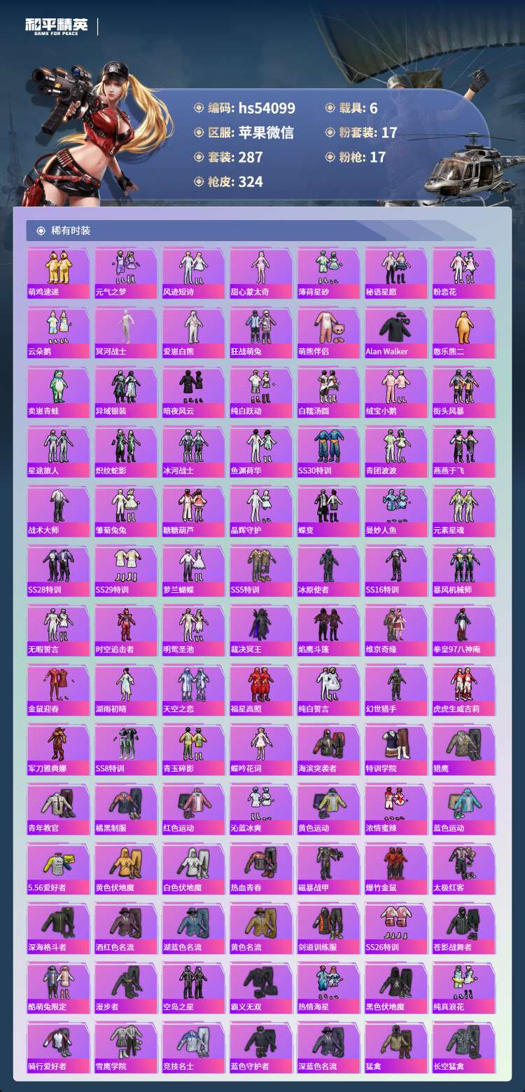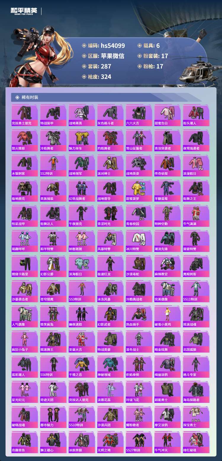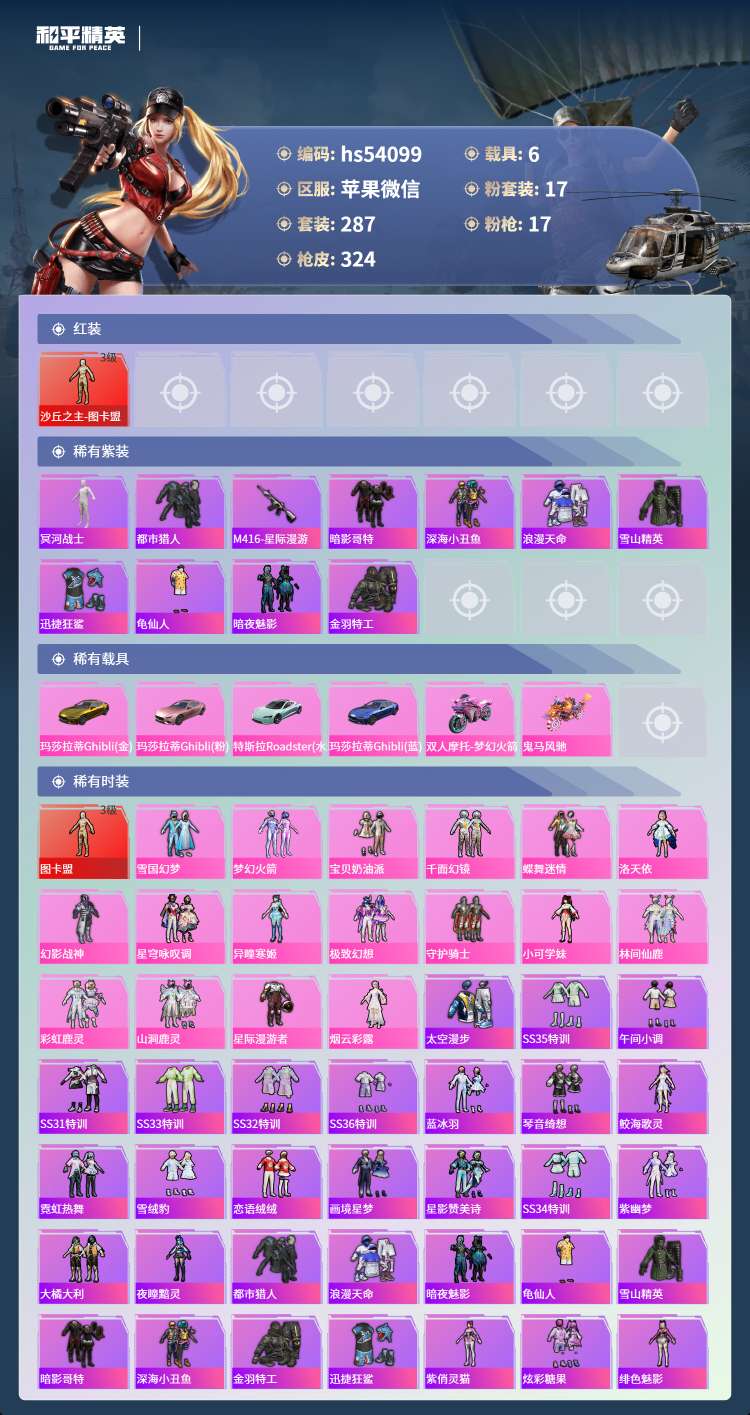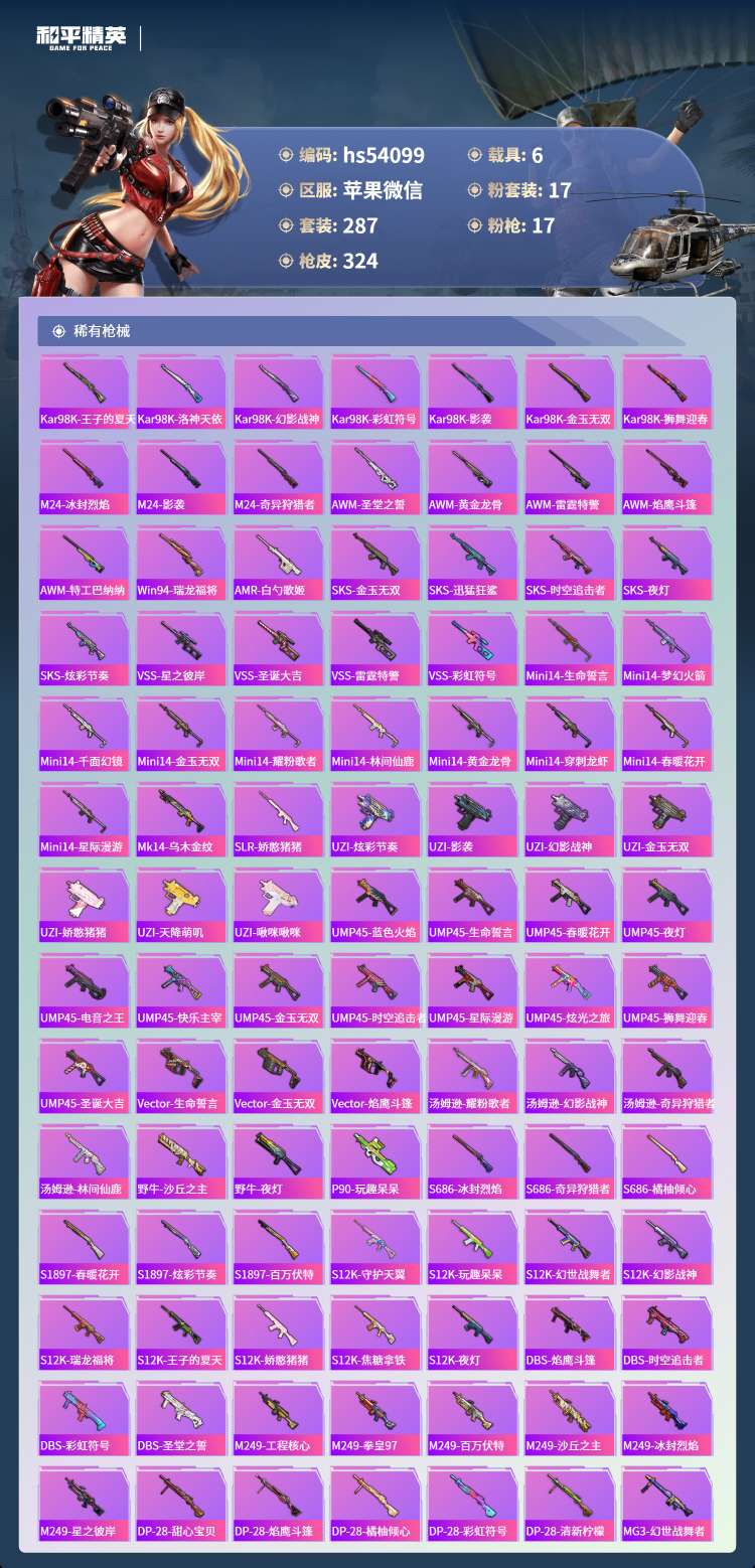 hs54099 苹果微-19王牌印记-有战神框-1红装-17粉装-17特效枪-6载具-140148