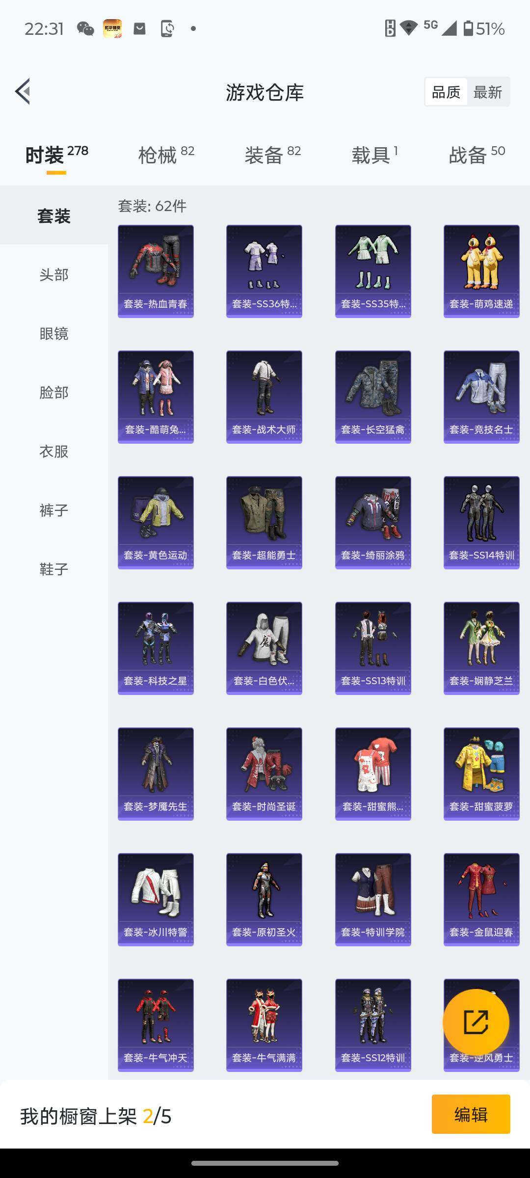62套装/装备82/载具1/战备50/热力值21799/特斯拉ModelX(珍珠白)/精灵迷巫降落伞/神秘黑猫降落伞/古堡领主降落伞/AKM-四圣焕新/AKM-夜灯/AKM-灼热熔岩/AKM-生命誓言/AKM-锦绣火鲤/AKM-霓虹街区/SCAR-L-红色方程式/M416-滑板小狐/M416-红色方程式/GROZA-春暖花开/GROZA-治愈之星/GROZA-黑色刀锋/AUG-魔法学院/QBZ-