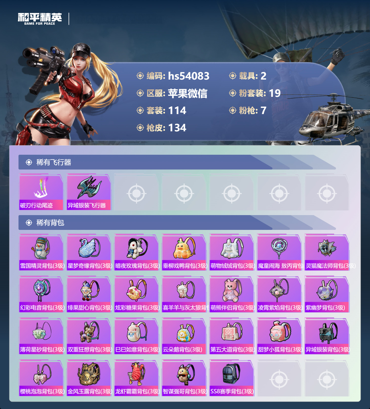 hs54083 苹果v-4王牌印记-19粉装-7特效枪-2载具-49613热力值-114套装-13