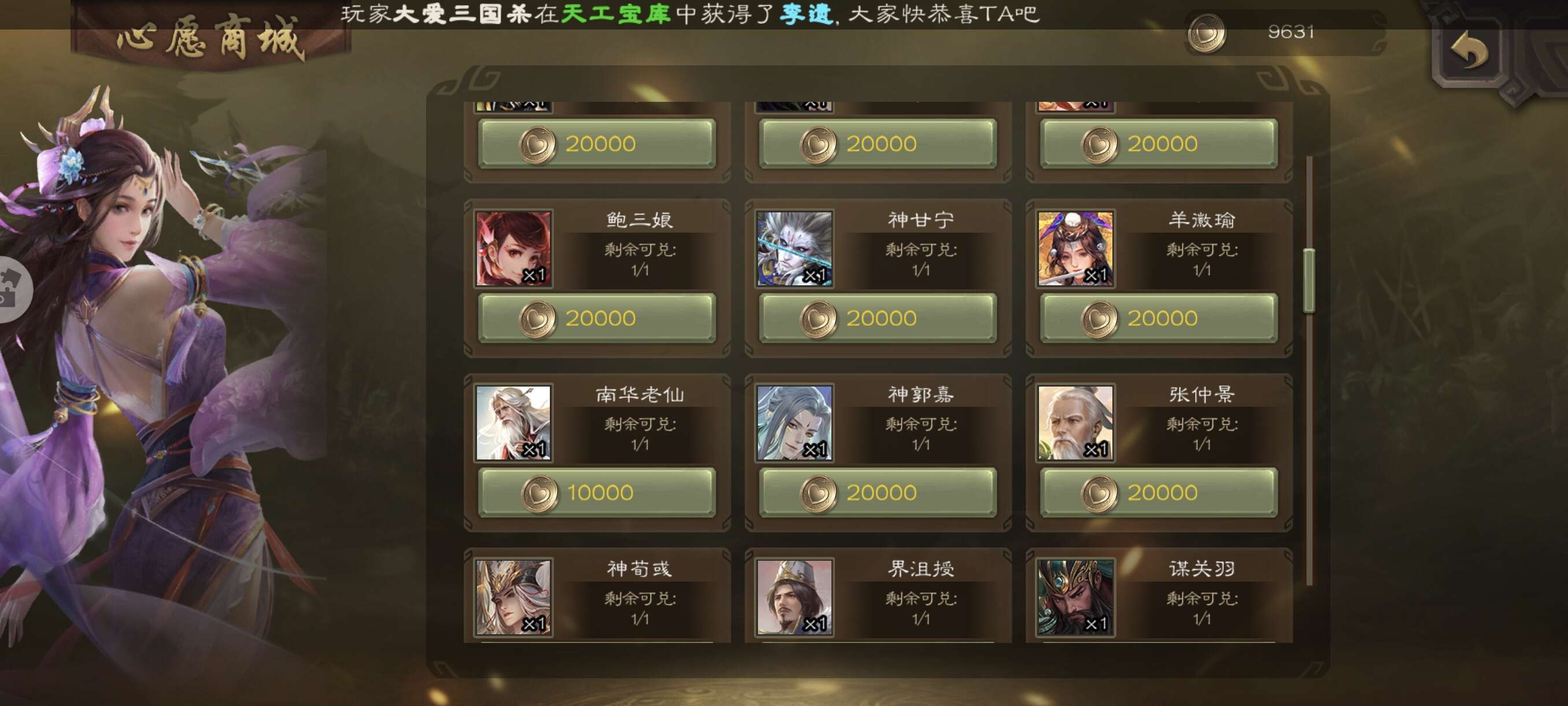 v10大将军十常侍,大宝,司马昭,还有很多好史诗,还差400换南华老仙,天宫精品多,好看动皮多