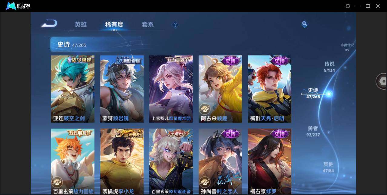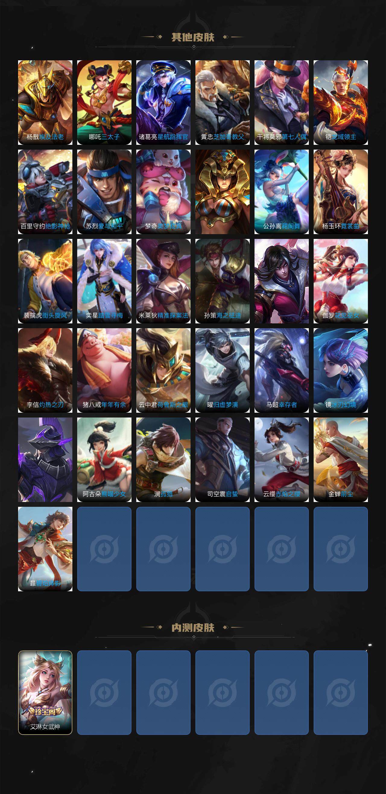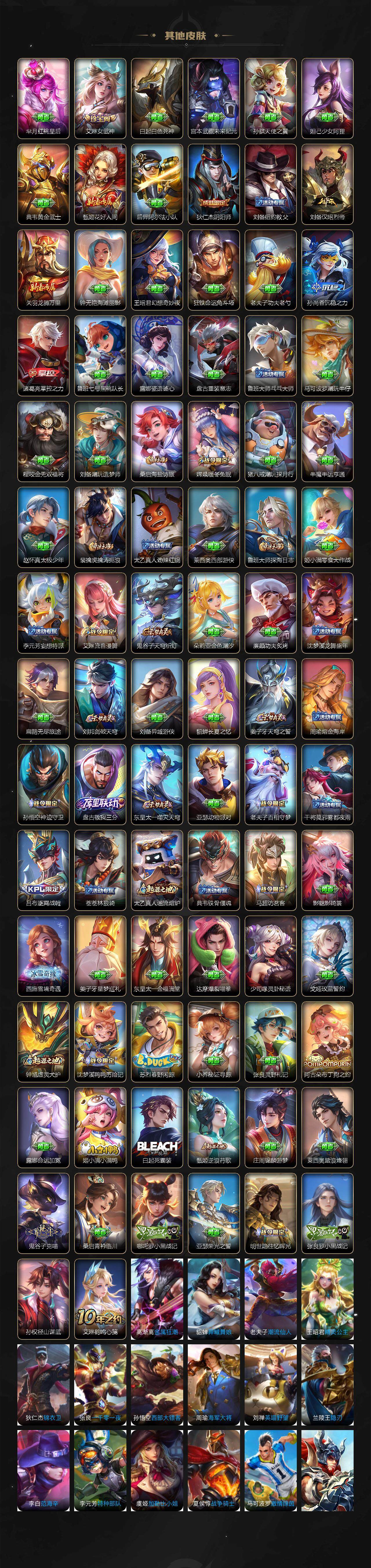 【限定皮肤】:蒙犽顽岩魄,姜子牙天穹之誓,狄仁杰阴阳师,赵云皇家上将,狄仁杰魔术师,项羽海滩派对,孙悟空至尊宝,百里玄策原初追逐者,裴擒虎李小龙