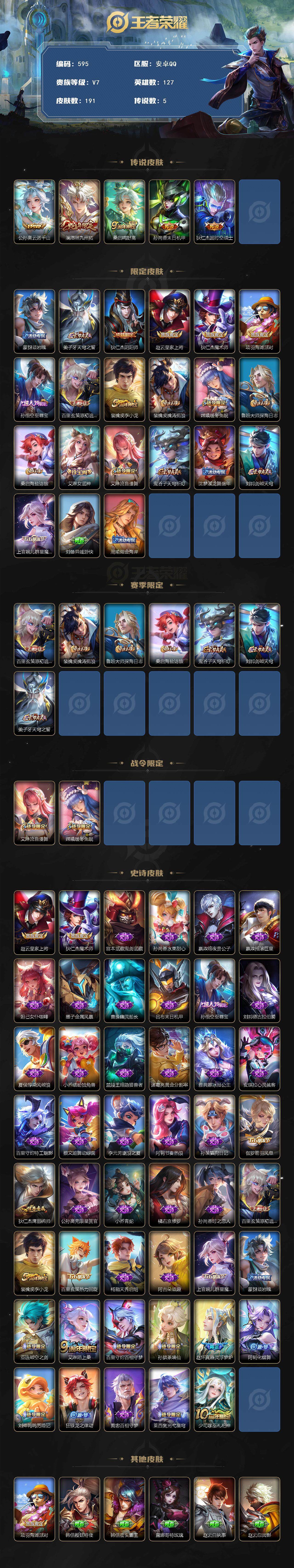1809797 王者荣耀账号 安卓Q-V7-最强王者段位-127英雄-191皮肤-5传说-47史诗