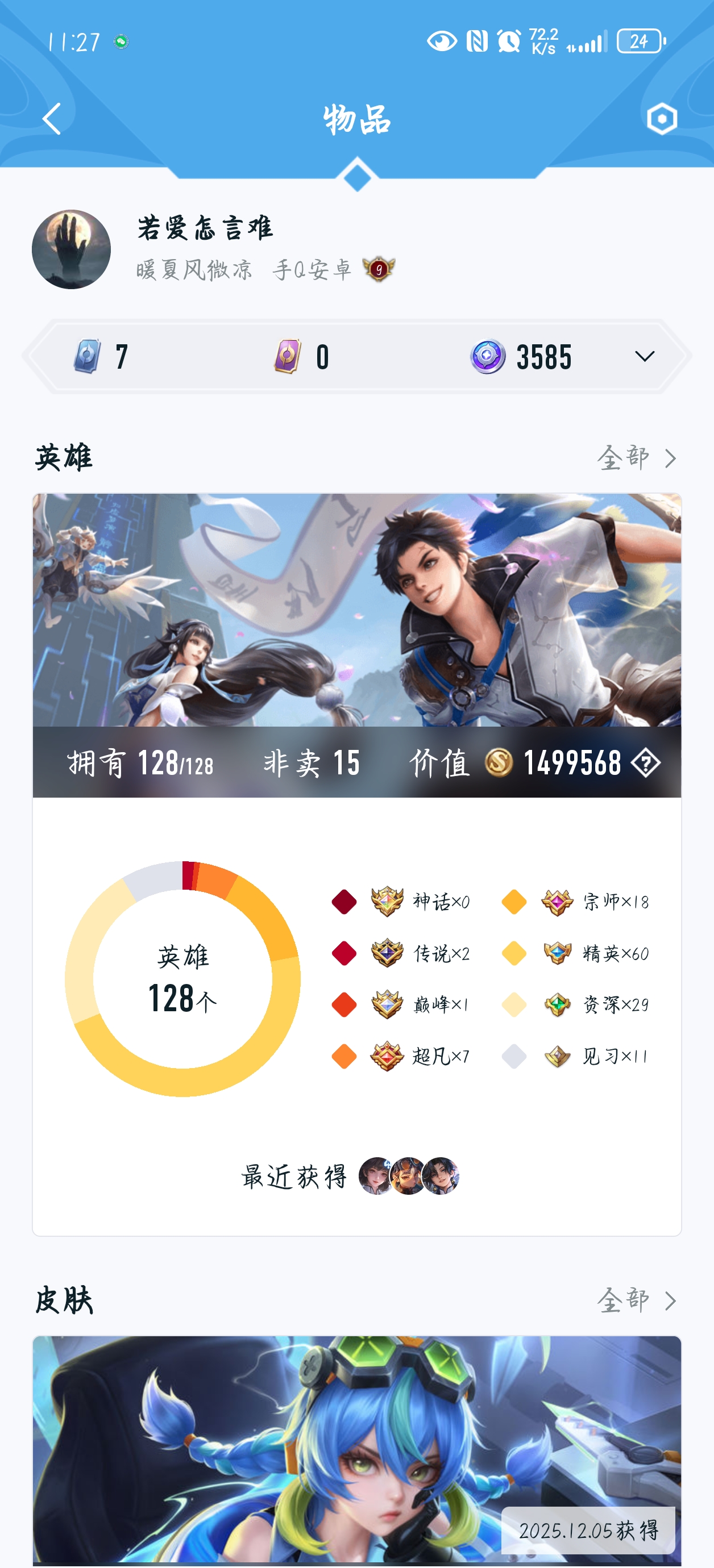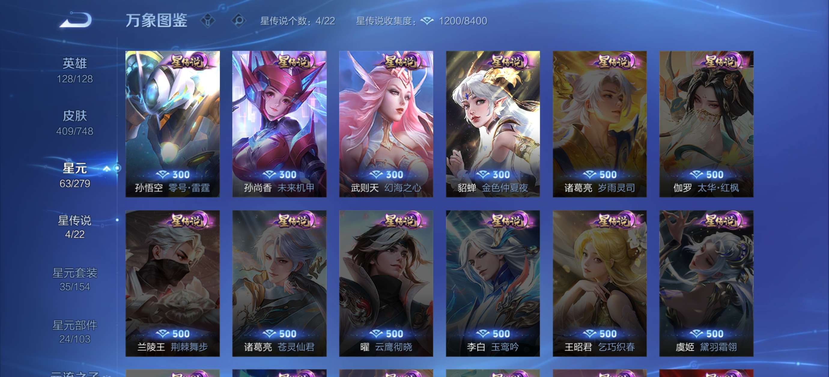 安卓QQ-6典藏-37传说-409皮肤-128英雄-荣耀王者-可议价,市标昭君,有武则天,皮肤碎片300多,按键也多,天幕两个,段位荣耀王者,