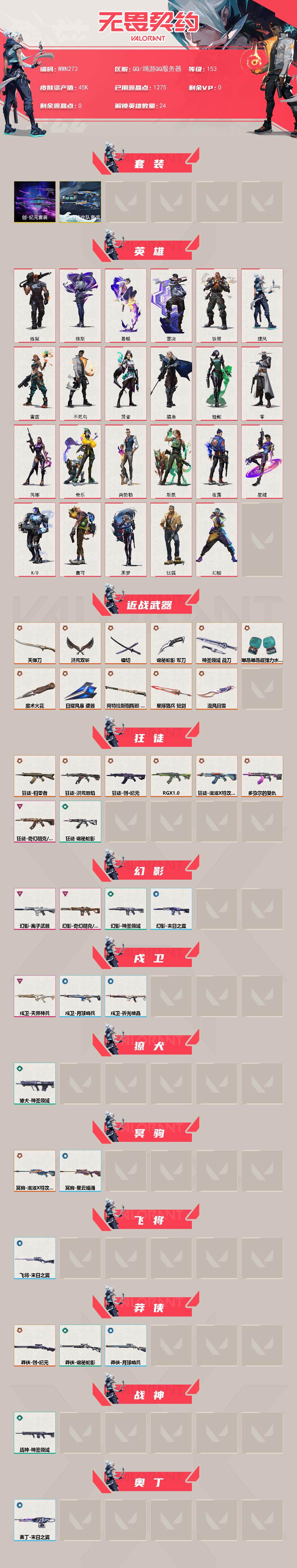 【WWN273】终极*23/卓越*6/皮肤*100/等级*153/段位:钻石/滋滋X特攻队套装/创·纪元套装/幻棱/炼狱/维斯/暮蝶/钛狐/壹决/铁臂/捷风/雷兹/不死鸟/贤者/猎枭/蝰蛇/零/芮娜/奇乐/尚勃勒/斯凯/夜露/星礈/K/O/盖可/黑梦/近战武器-流风回雪/近战武器-魔术火花/近战武器-嘟昂嘟昂超弹力水球拳套/近战武器-镭切/近战武器-洪荒双斩/近战武器-天御刀/近战武器-诡秘蛇影 军刀/近战武器-神圣领域 战刀/近战武器-日耀风暴 遗器/近战武器-阿特拉斯指挥部 甩棍/近战武器-