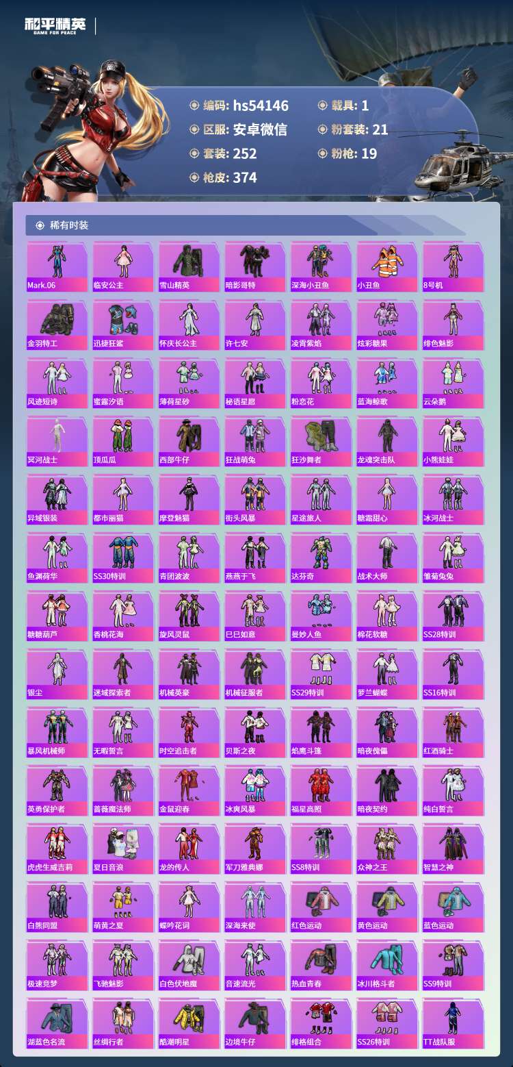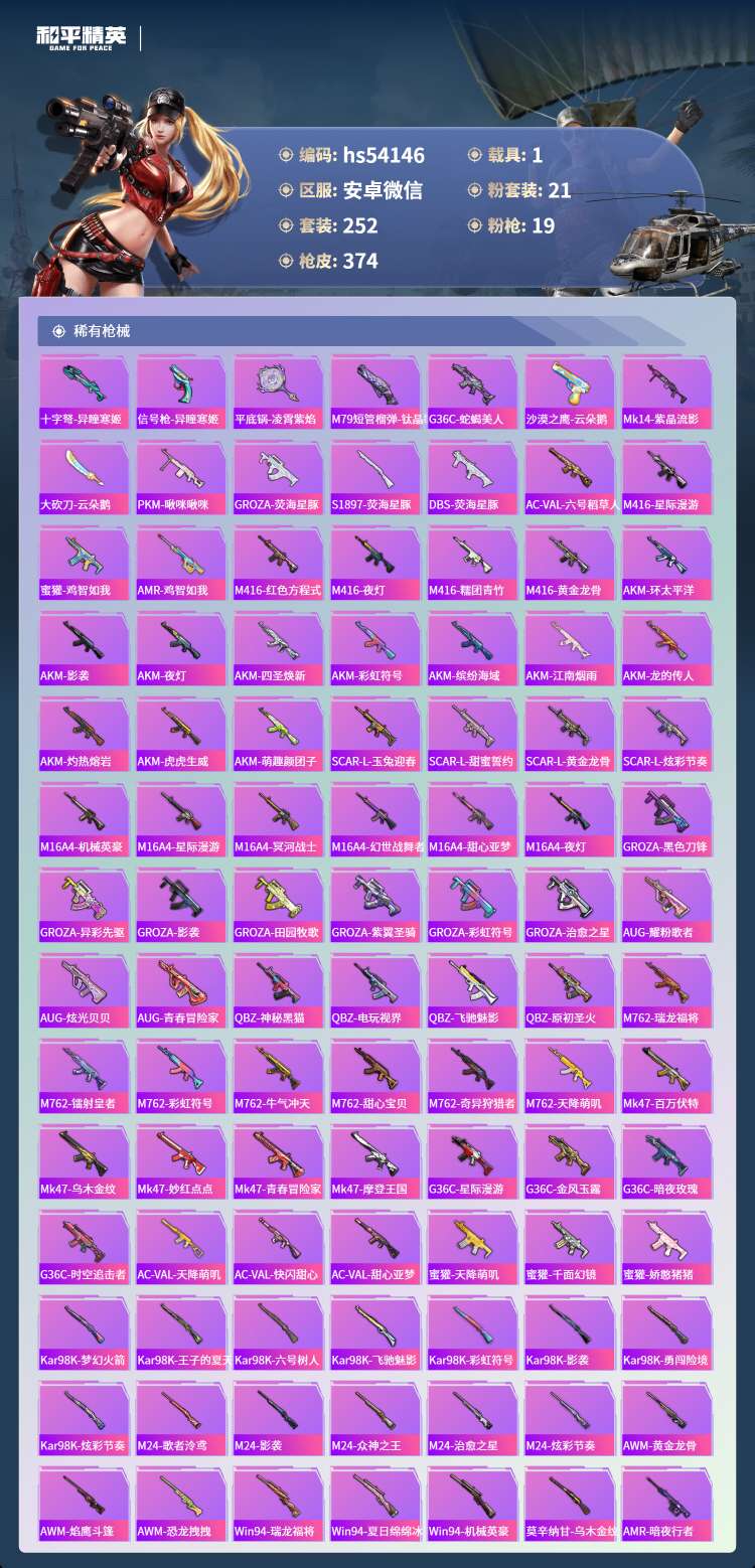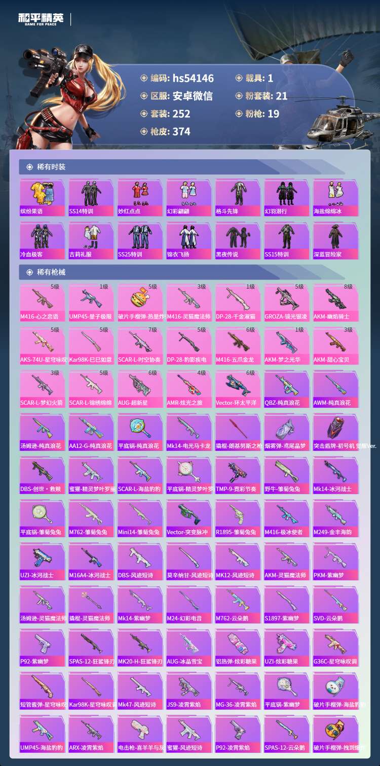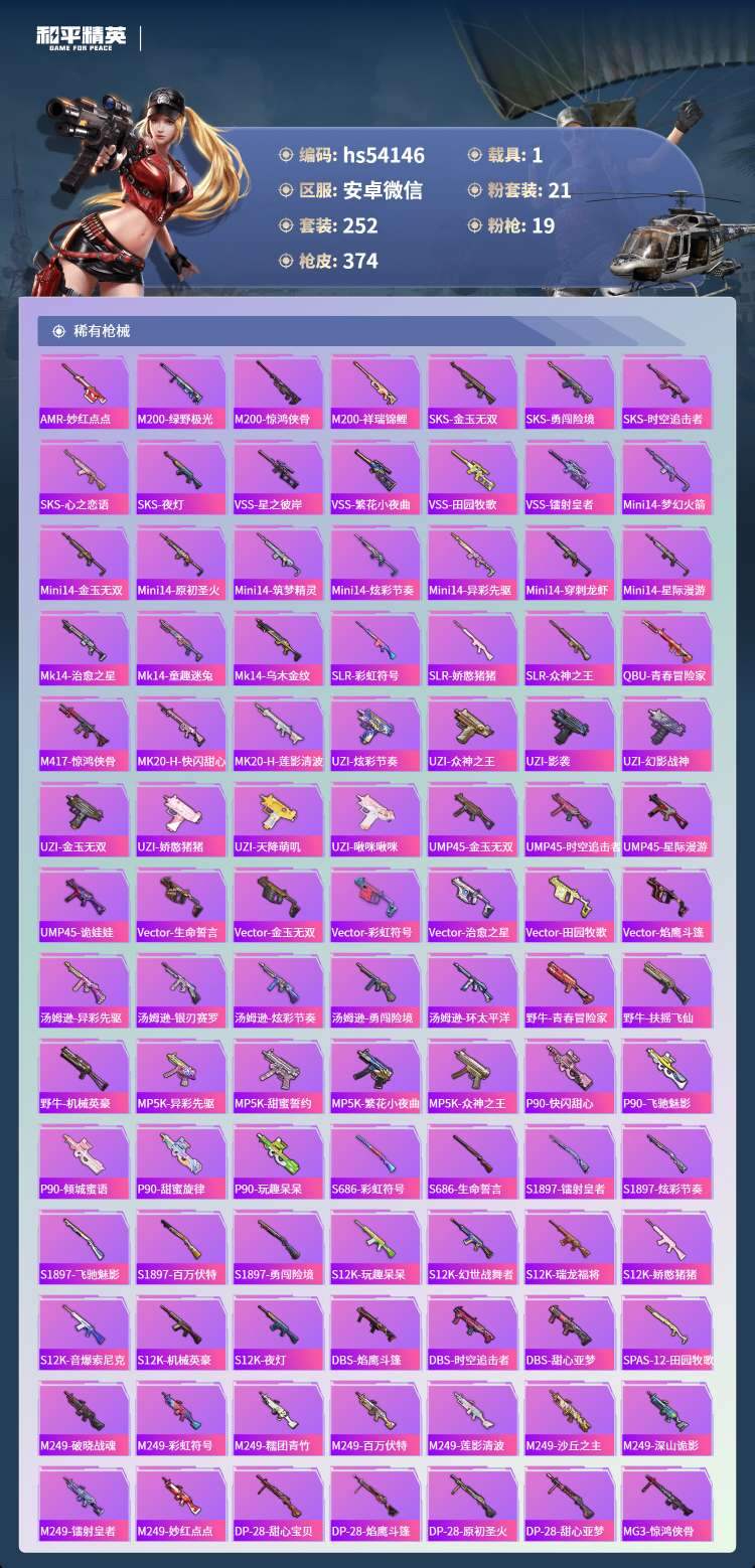 hs54146 安卓微-18王牌印记-1红装-21粉装-19特效枪-1载具-130655热力值-2