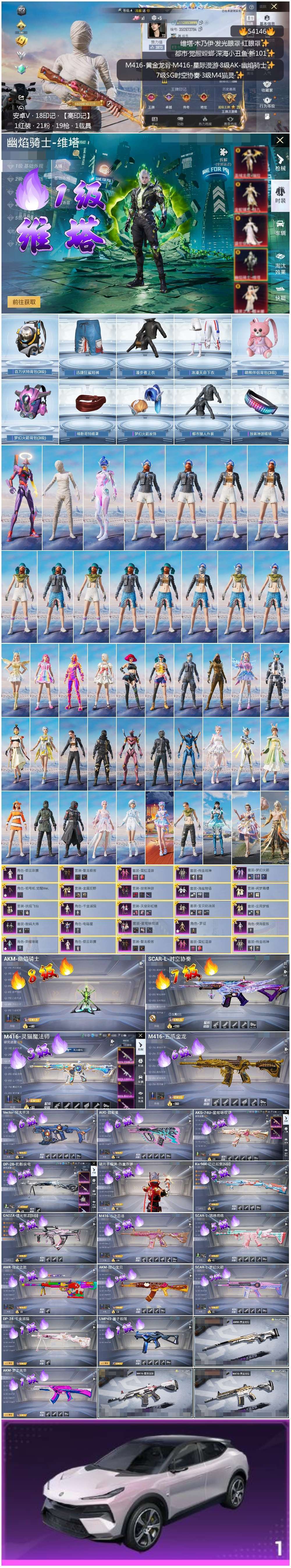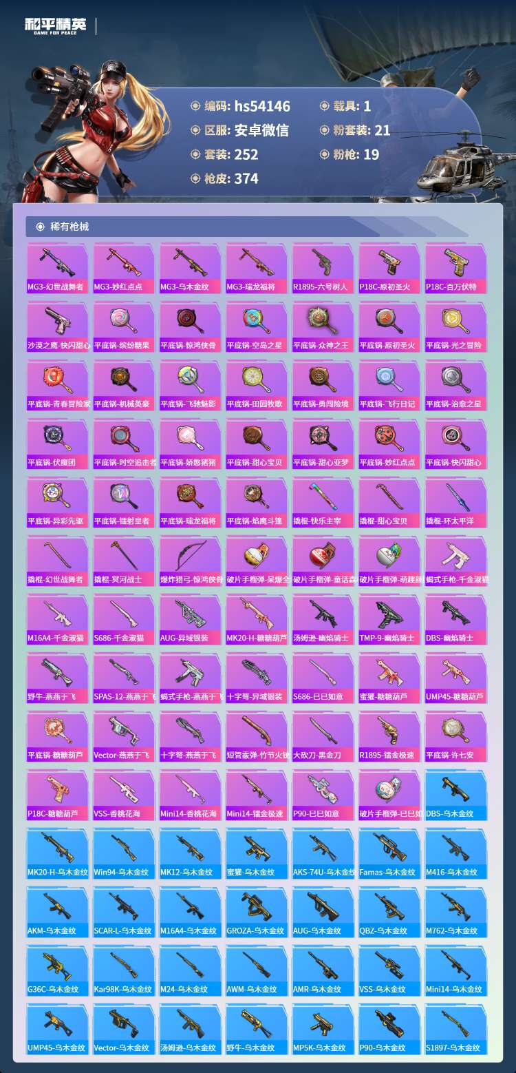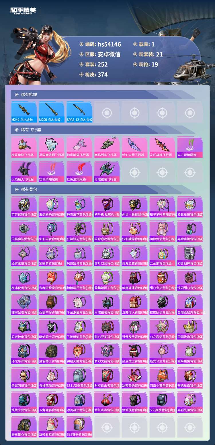 hs54146 安卓微-18王牌印记-1红装-21粉装-19特效枪-1载具-130655热力值-2