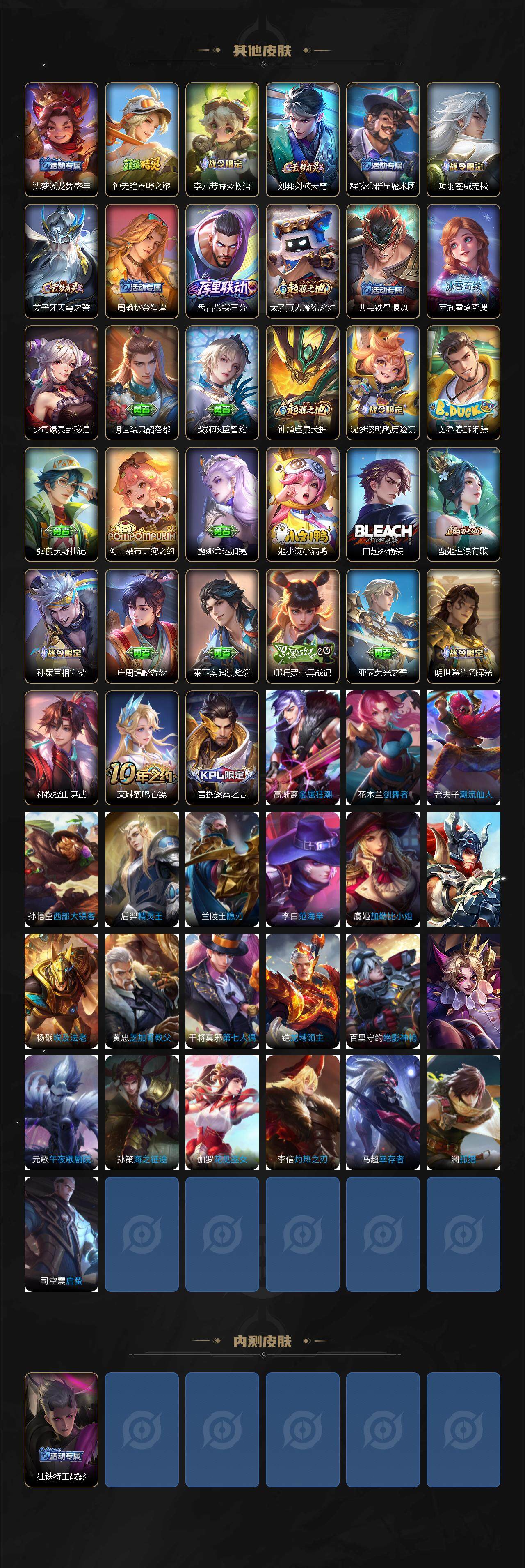 【限定皮肤】:姜子牙天穹之誓,狄仁杰阴阳师,赵云皇家上将,项羽海滩派对,女娲朔望之晖,蔡文姬繁星吟游,百里玄策原初追逐者,云中君纤云弄巧,张良古海寻踪,鬼谷子天穹祈灯,沈梦溪