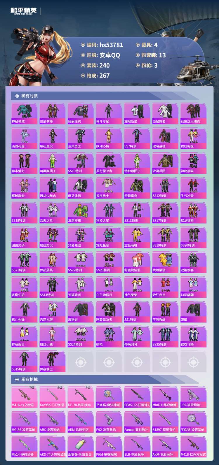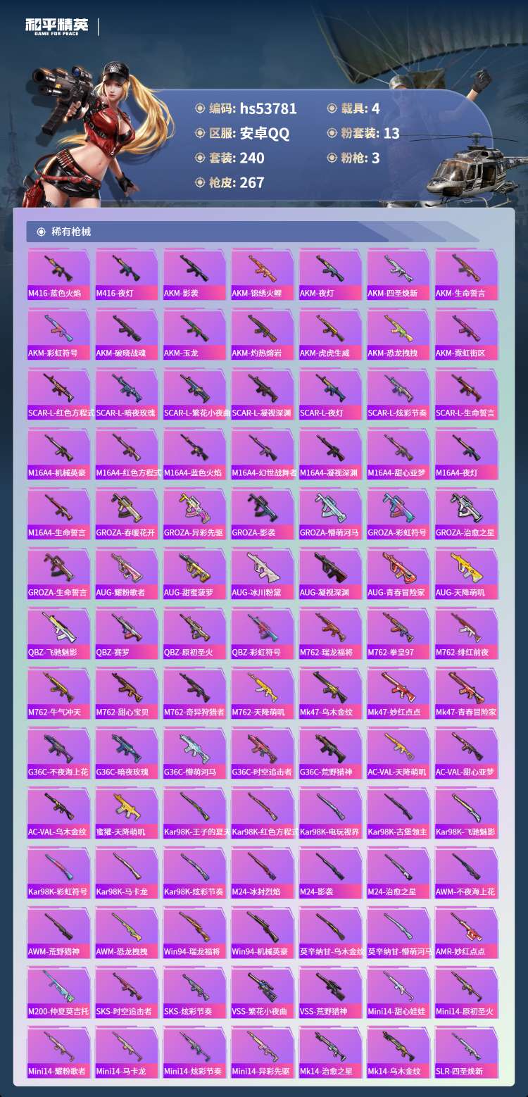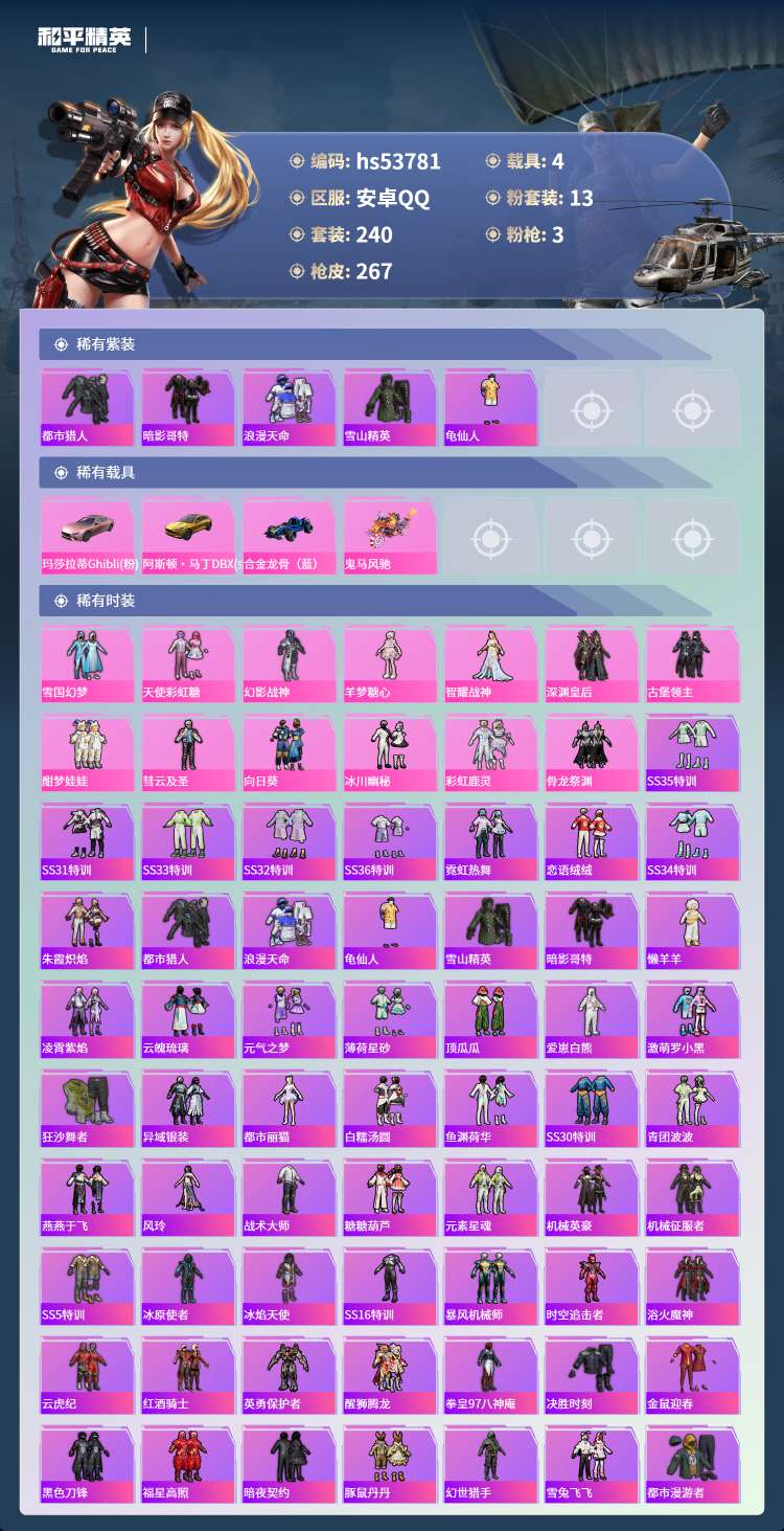 hs53781 安卓手Q-19王牌印记-13粉装-3特效枪-4载具-93757热力值-240套装-2