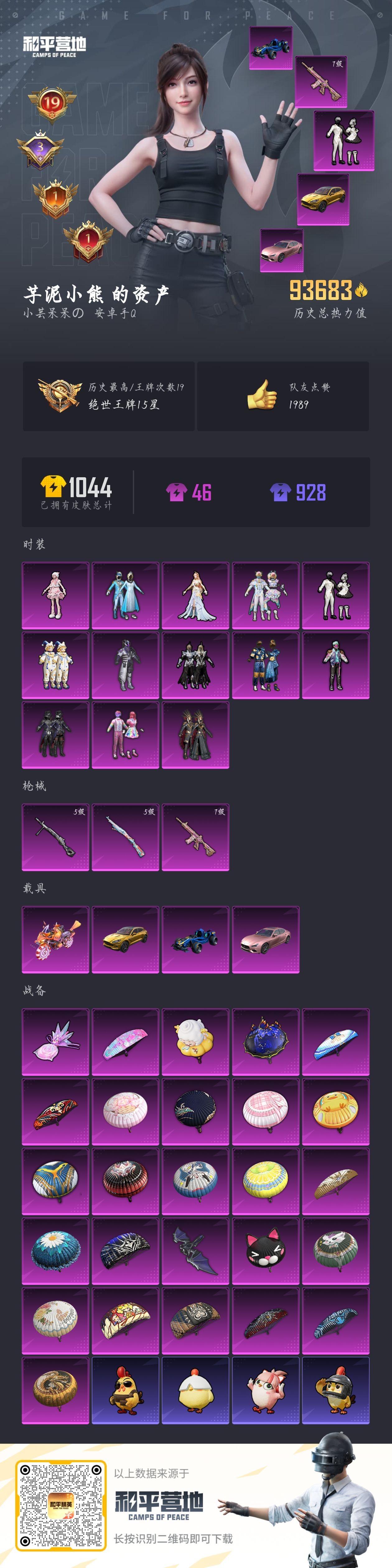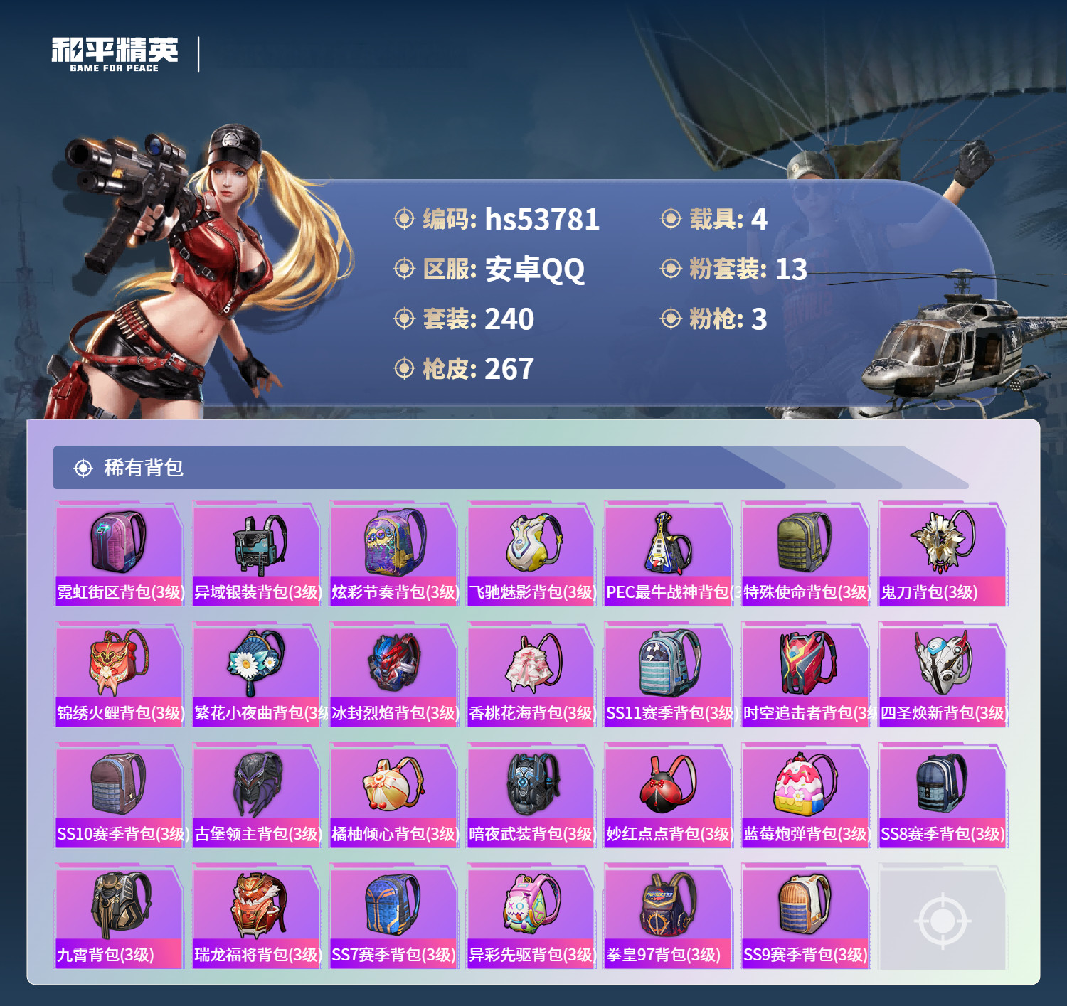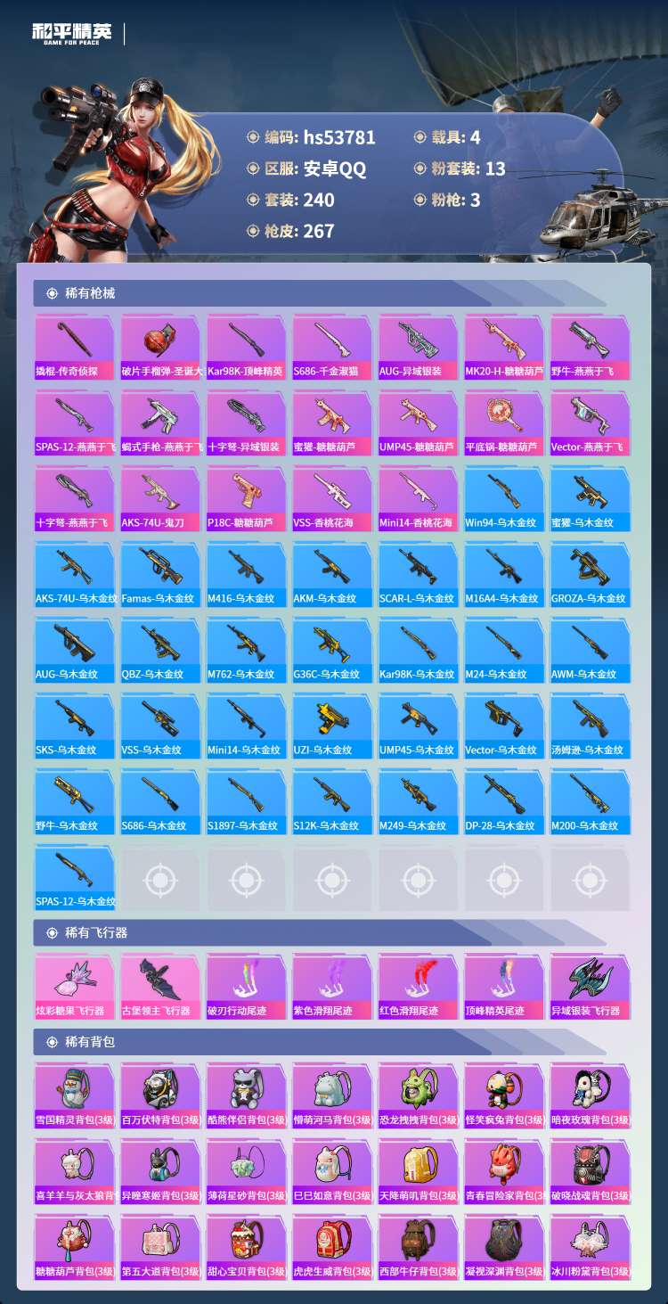 hs53781 安卓手Q-19王牌印记-13粉装-3特效枪-4载具-93757热力值-240套装-2