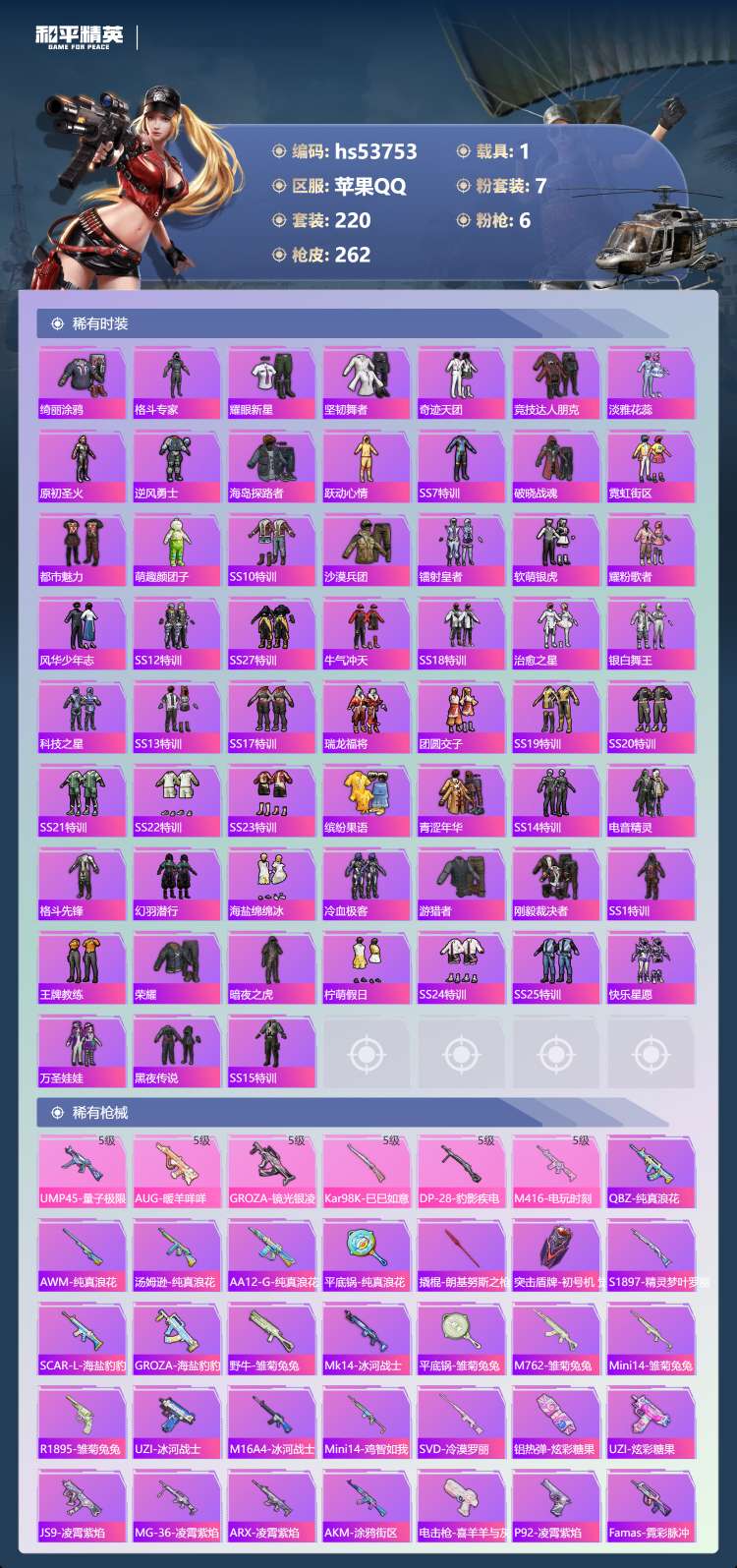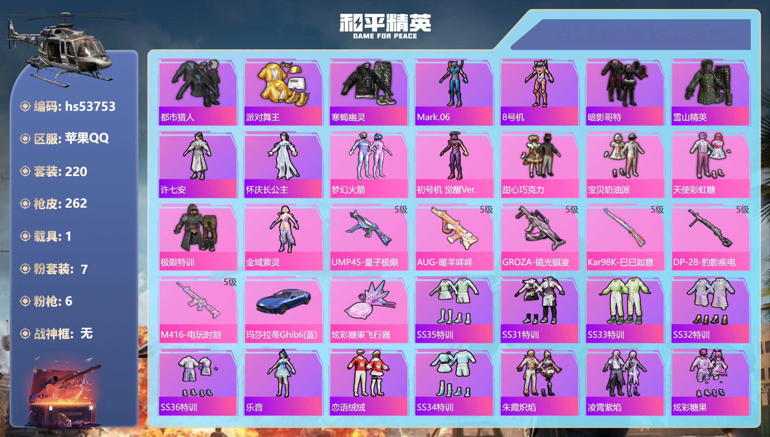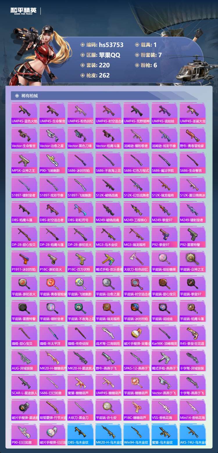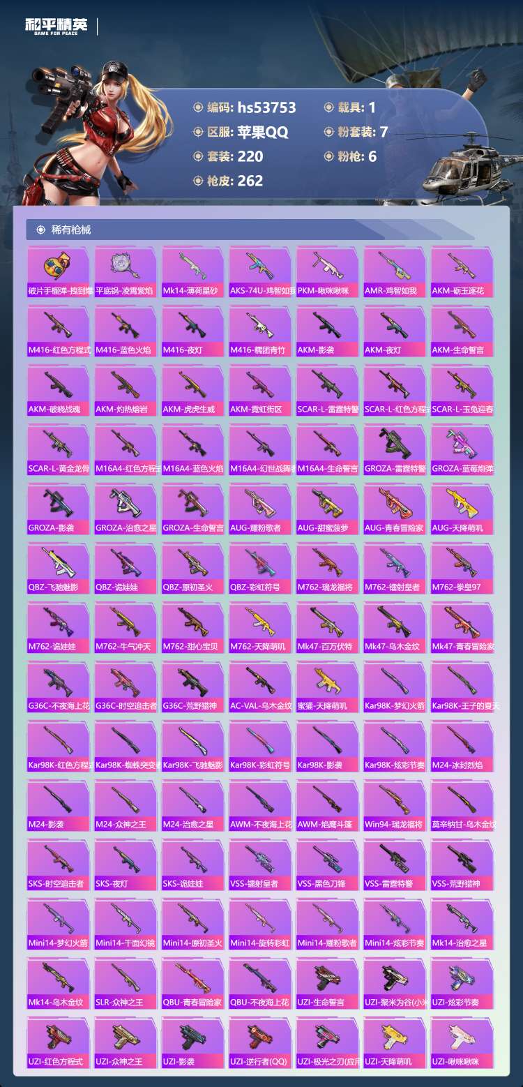 hs53753苹果手Q-16王牌印记-7粉装-6特效枪-1载具-82368热力值-220套装-262