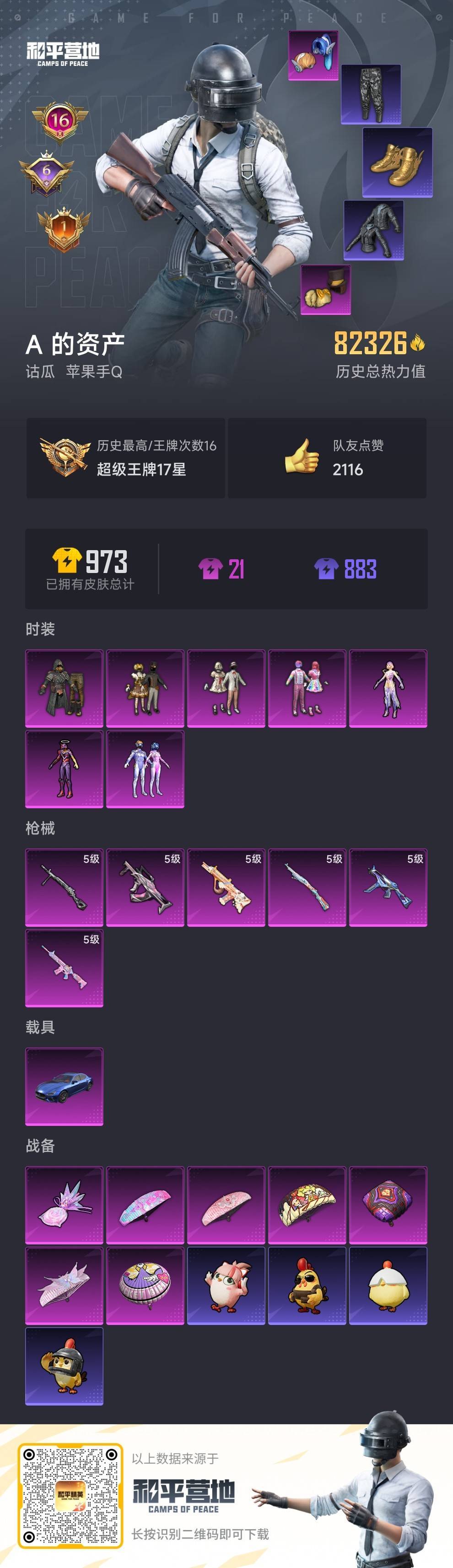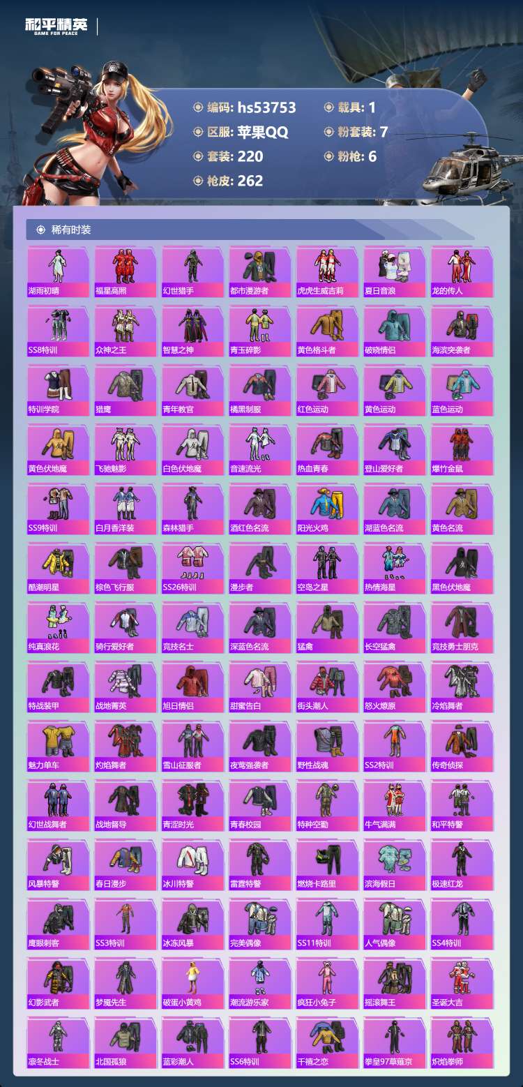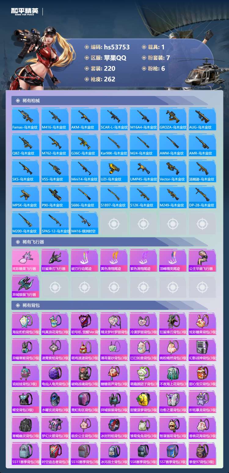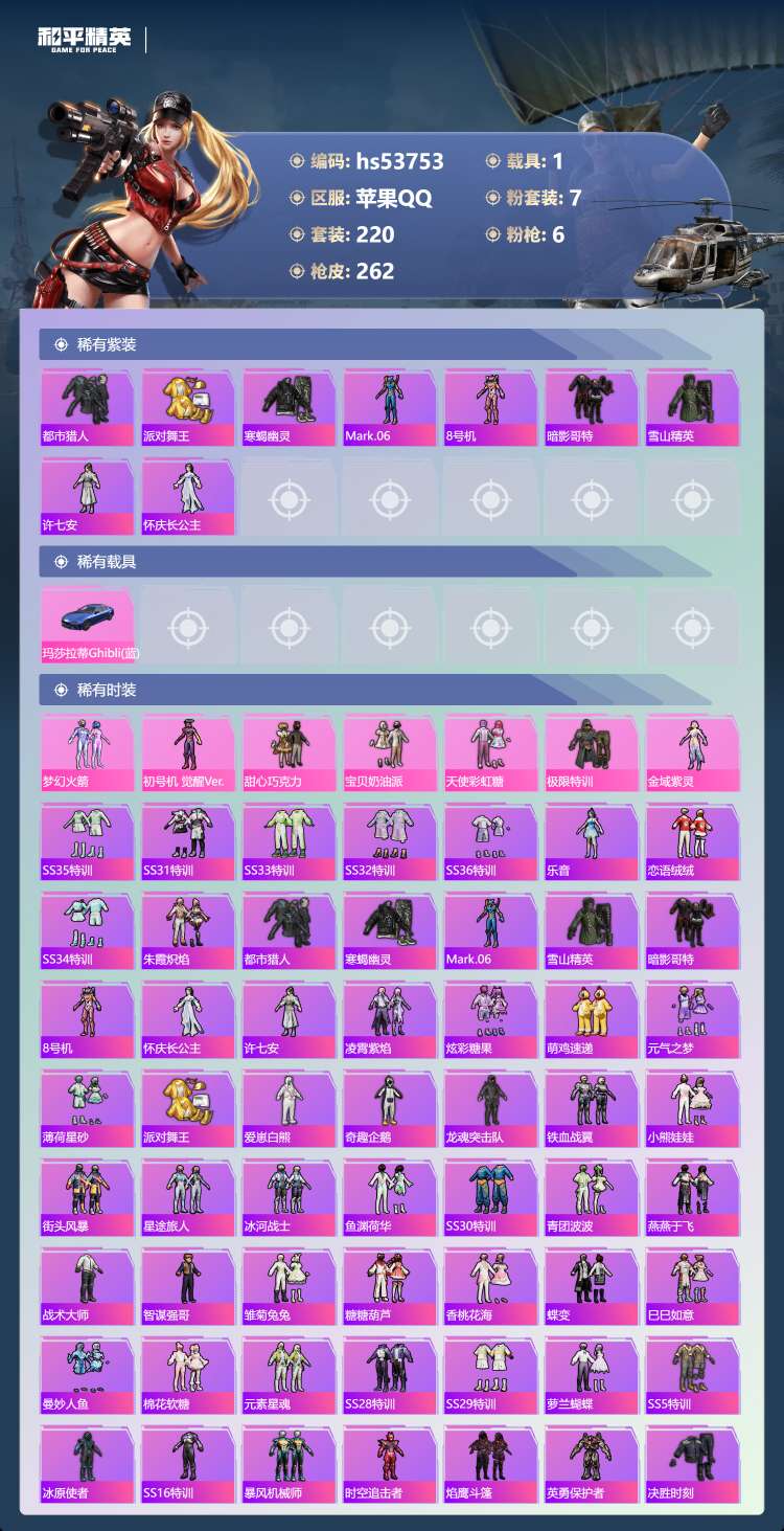 hs53753苹果手Q-16王牌印记-7粉装-6特效枪-1载具-82368热力值-220套装-262