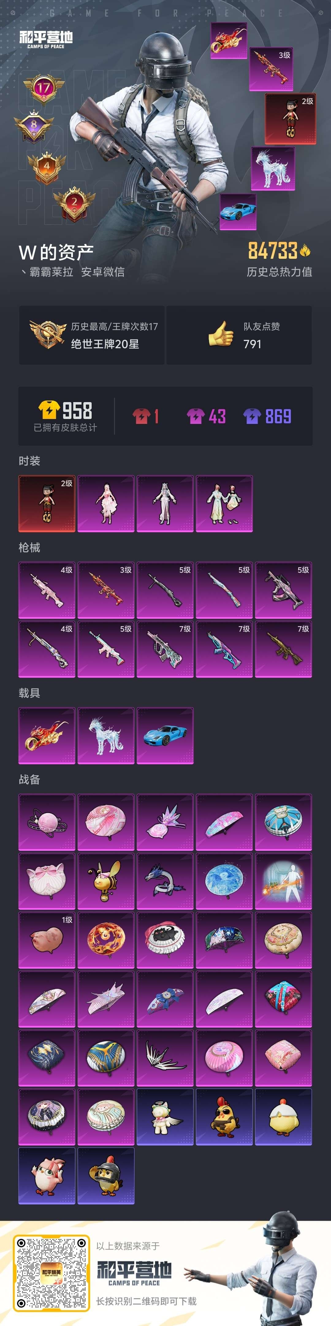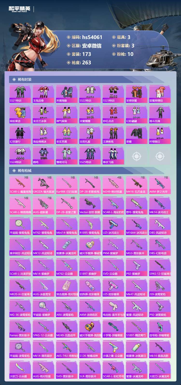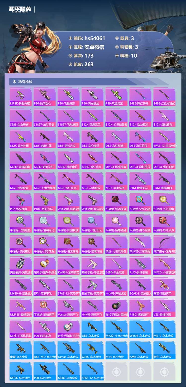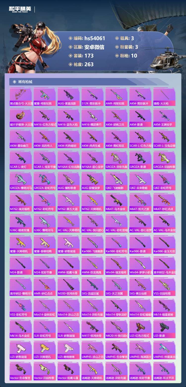 hs54061 安卓微-17王牌印记-1红装-3粉装-10特效枪-3载具-84733热力值-173