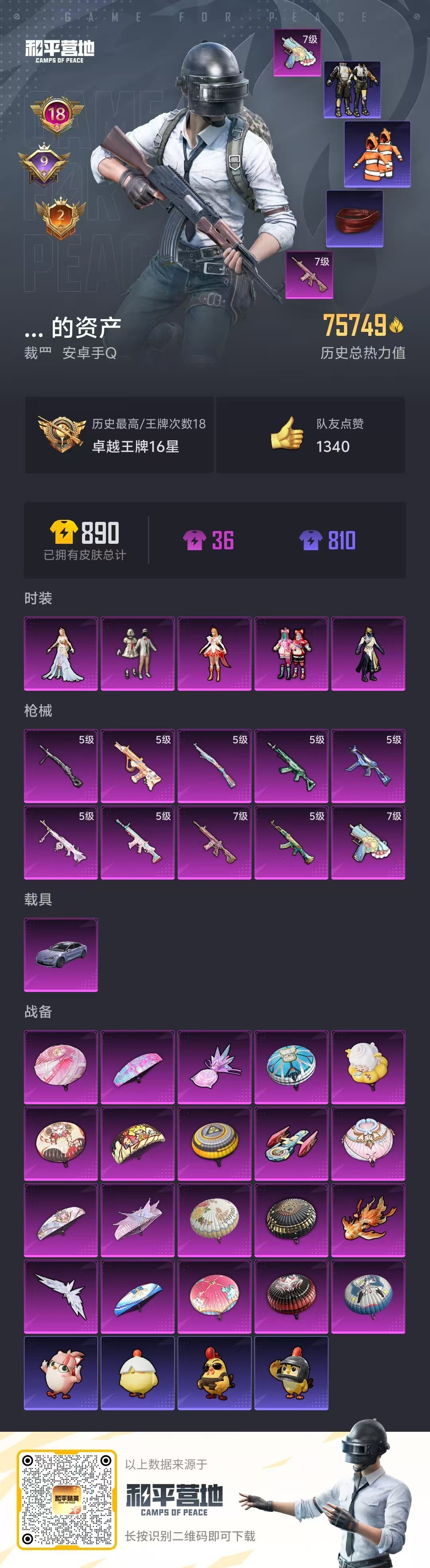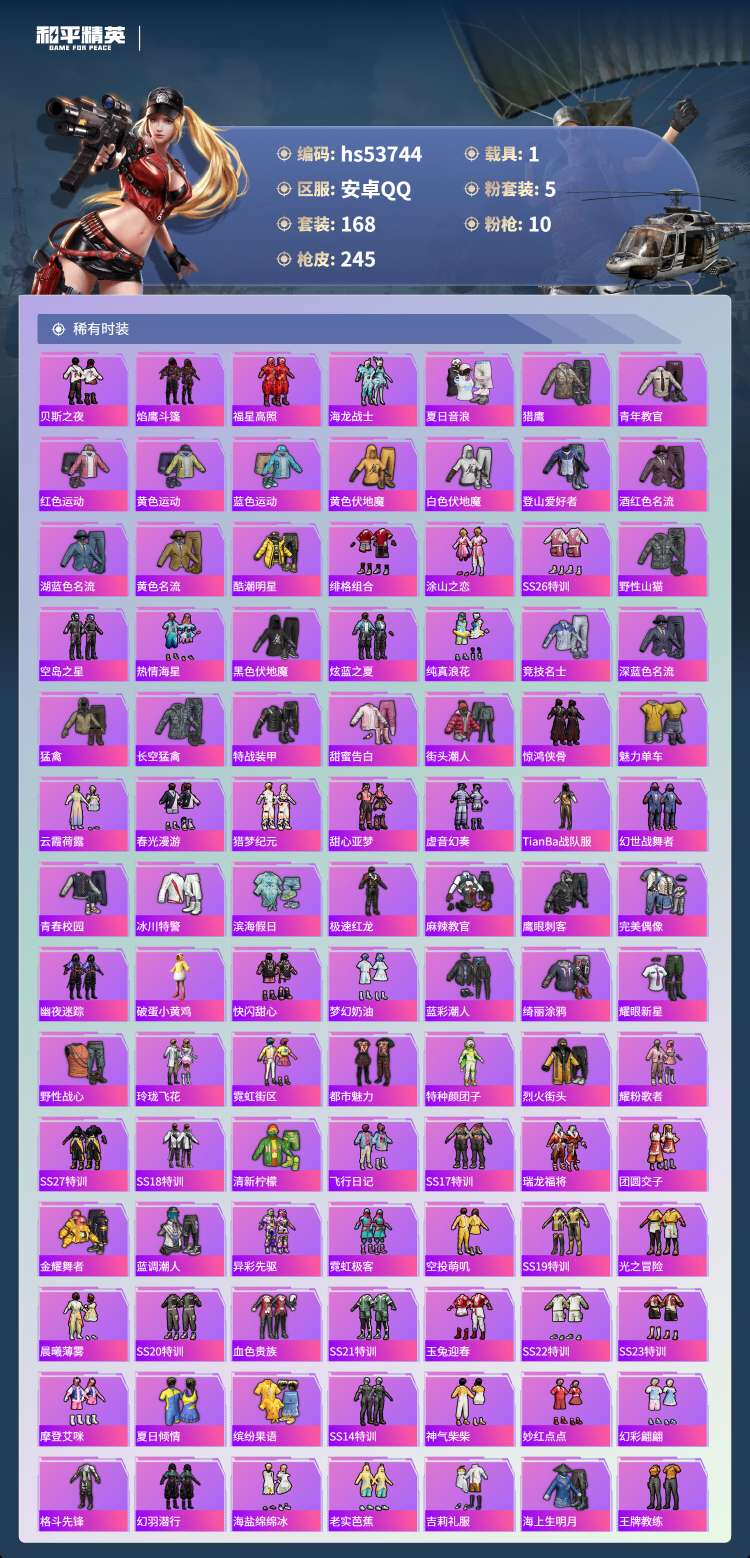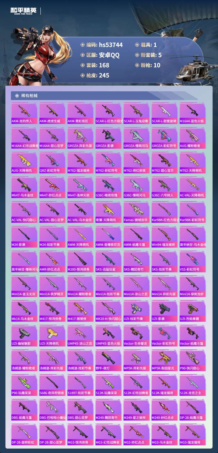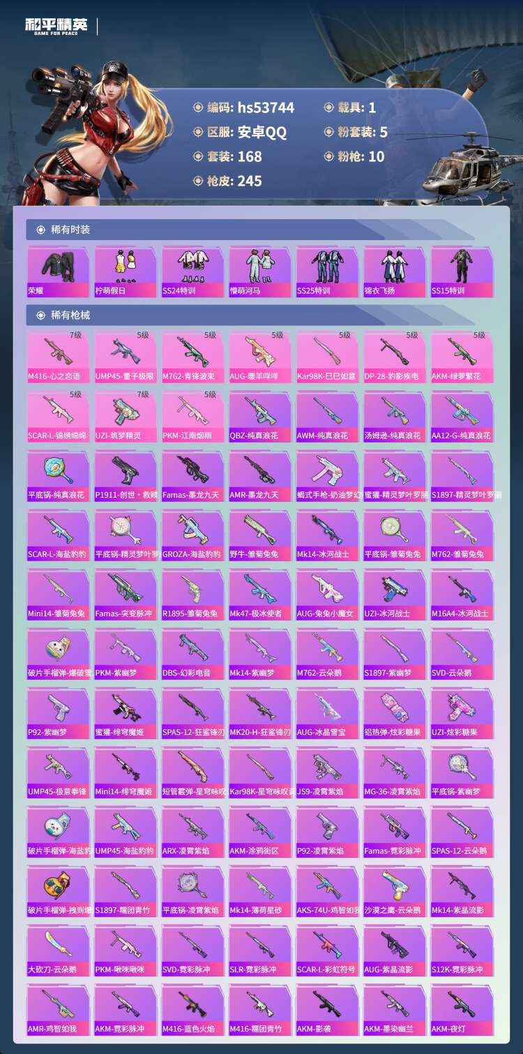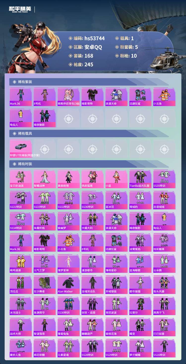 hs53744 安卓手Q-18王牌印记-5粉装-10特效枪-1载具-75749热力值-168套装-2