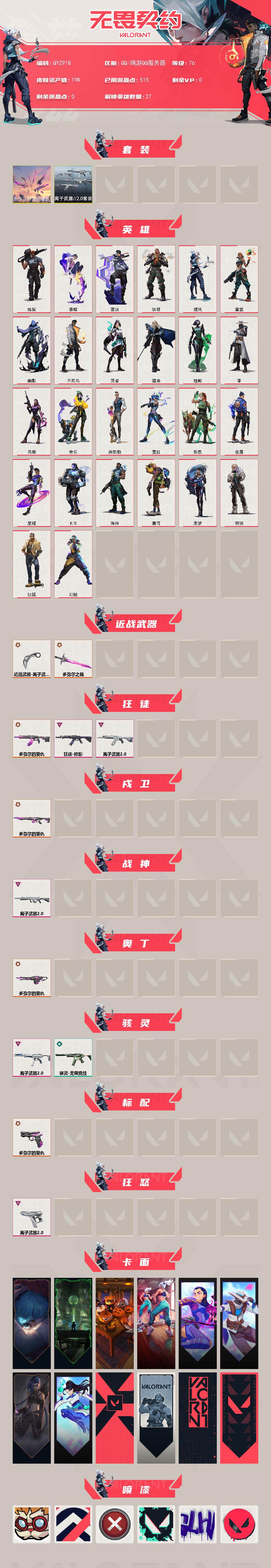 【QYZ918】终极*7/卓越*5/皮肤*26/等级*76/段位:铂金/多弥尔的复仇套装/离子武器//2.0套装/幻棱/炼狱/暮蝶/钛狐/壹决/铁臂/捷风/雷兹/幽影/不死鸟/贤者/猎枭/蝰蛇/零/芮娜/奇乐/尚勃勒/霓虹/斯凯/夜露/星礈/K/O/海神/盖可/黑梦/钢锁/近战武器-多弥尔之裁/近战武器-离子武器//2.0 爪刀/狂徒-多弥尔的复仇/狂徒-掠影/狂徒-离子武器//2.0/戍卫-多弥尔的复仇/战神-离子武器//2.0/奥丁-多弥尔的复仇/骇灵-离子武器//2.0/骇灵-无限竞技/标