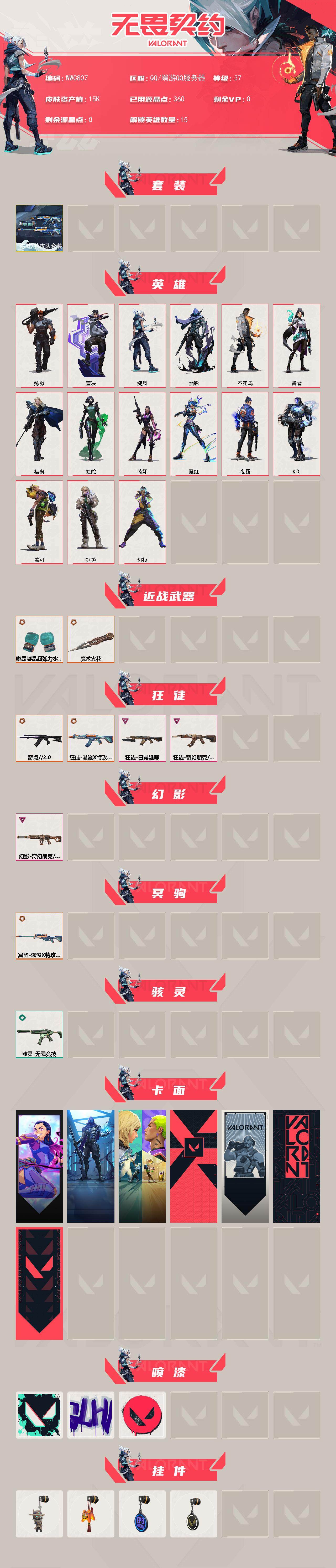 【WWC807】终极*5/卓越*3/皮肤*21/等级*37/段位:白银/滋滋X特攻队套装/幻棱/炼狱/壹决/捷风/幽影/不死鸟/贤者/猎枭/蝰蛇/芮娜/霓虹/夜露/K/O/盖可/钢锁/近战武器-魔术火花/近战武器-嘟昂嘟昂超弹力水球拳套/狂徒-奇点//2.0/狂徒-滋滋X特攻队/狂徒-日冕雄师/狂徒-奇幻朋克//3.0/幻影-奇幻朋克//3.0/冥驹-滋滋X特攻队/骇灵-无限竞技/无畏契约GO!第一卷:芮娜 卡面/暗枪 卡面/钢锁vs盖可 卡面/代号红色 卡面/新兵报到 卡面/V契约 卡面/无畏
