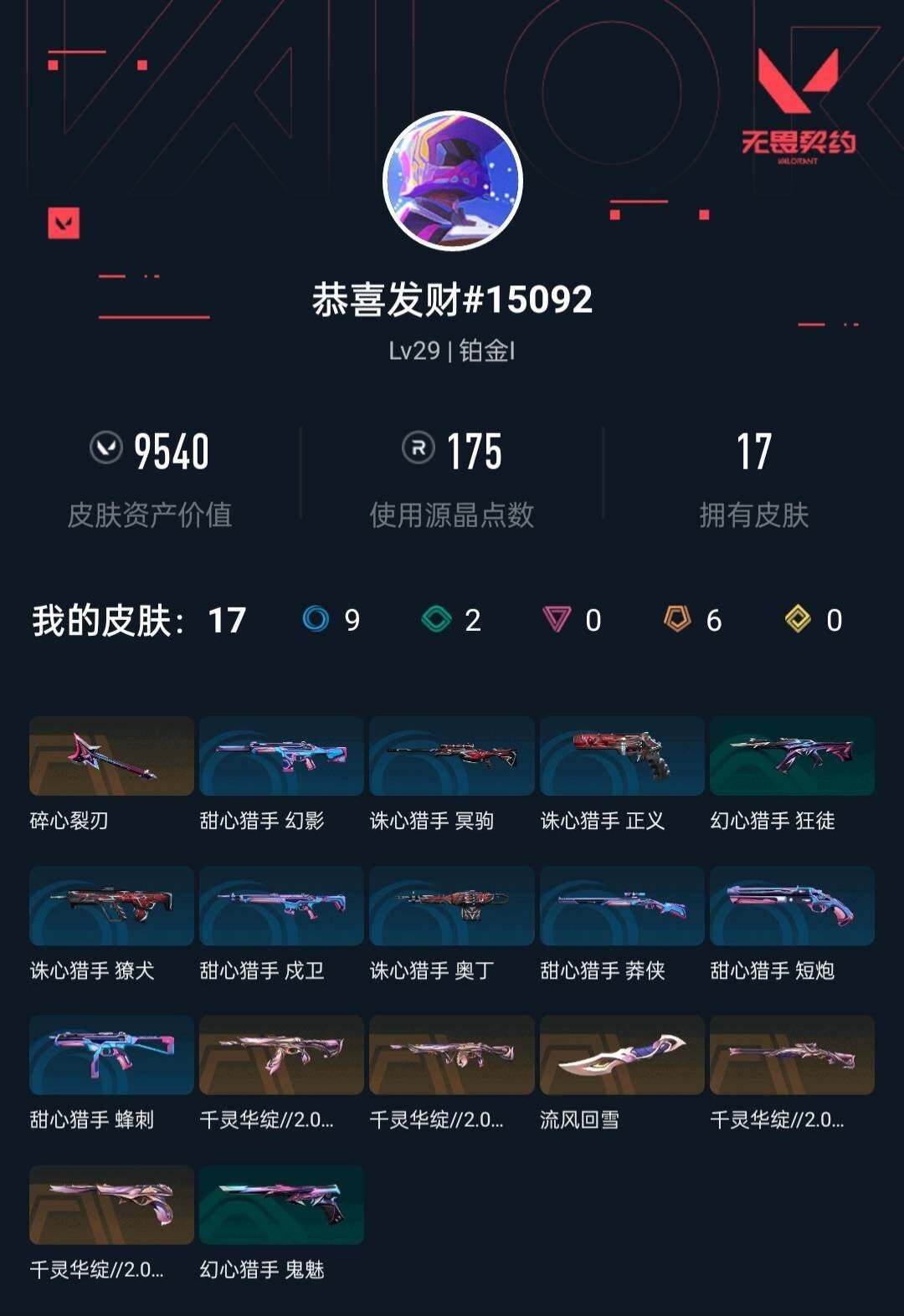 【WWC809】终极*6/皮肤*17/等级*29/段位:铂金/千灵华绽//2.0套装/炼狱/捷风/雷兹/不死鸟/贤者/猎枭/芮娜/夜露/近战武器-流风回雪/狂徒-千灵华绽//2.0/莽侠-千灵华绽//2.0/战神-千灵华绽//2.0/鬼魅-千灵华绽//2.0/复古浪潮 卡面/代号红色 卡面/新兵报到 卡面/V契约 卡面/无畏契约 卡面/胜利属于无畏契约 喷漆/GLHF 喷漆/无畏契约 喷漆/无畏契约 纪念币 挂饰
