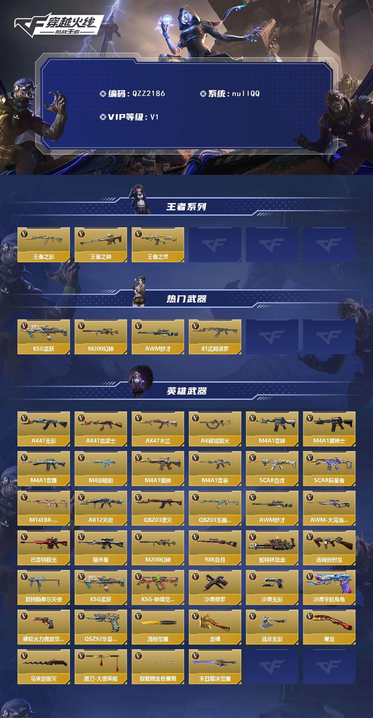 【QZZ2186】VIP1/73V/王者之影/王者之神/王者之誉/KSG-孟获/M200-幻神/AWM-妙才/81式-阿波罗/AK47-无影/AK47-血武士/AK47-木兰/AK47-谜城烟火/M4A1-雷神/M4A1-黑骑士/M4A1-雷霆/M4A1-运输船/M4A1-猎神/M4A1-雷暴/SCAR Light-白虎/SCAR-探星者/M14EBR-拂影/AK12-天启/QBZ03-湮灭/QBZ03-玉面羞花/AWM妙才/AWM-大湾溢彩/巴雷特-极光/暗杀星/M200幻神/98K-血月/加