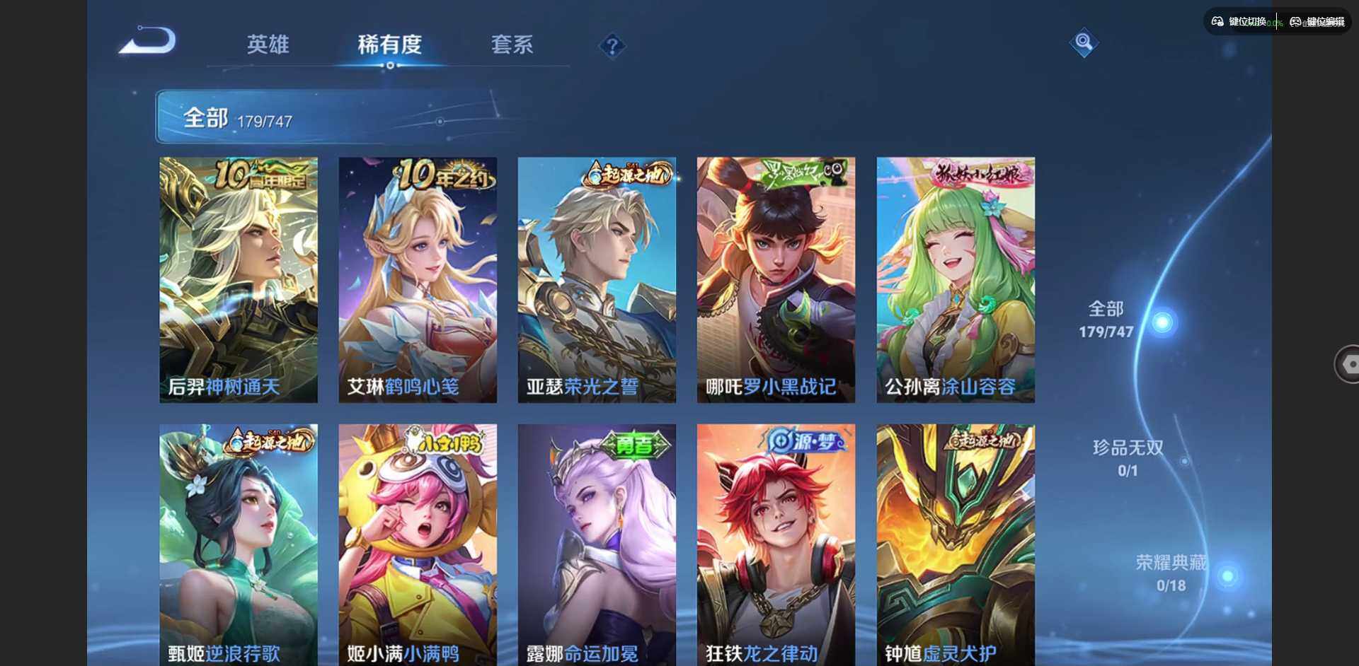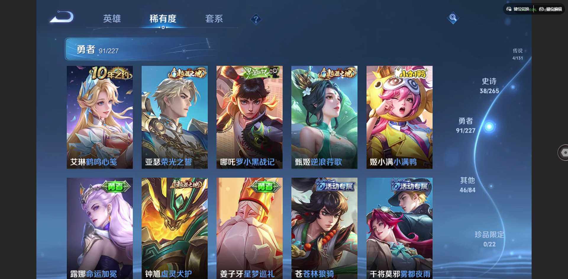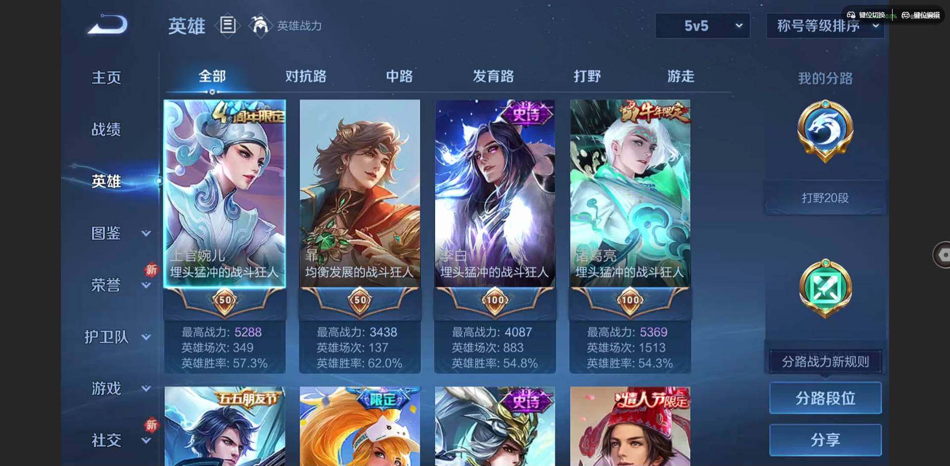 贵族等级: V6 英雄数: 125 皮肤数: 179 传说皮: 冠军飞将,神树