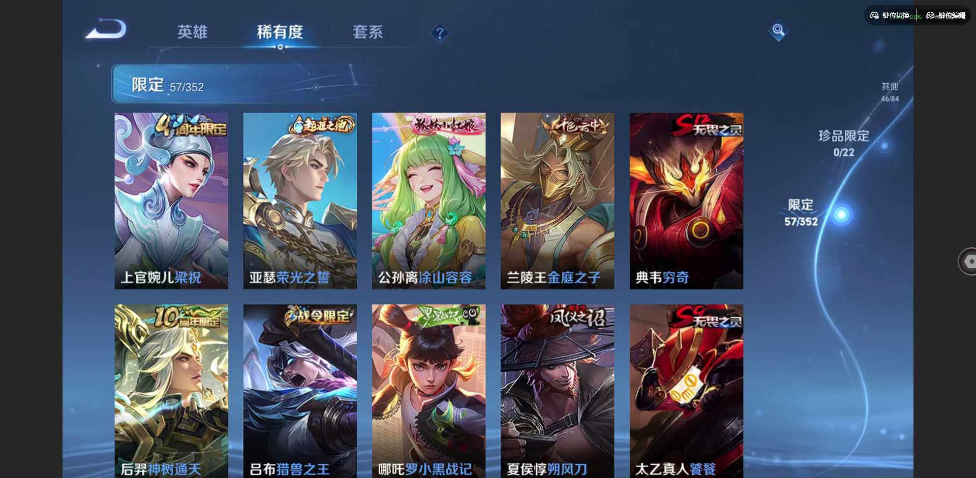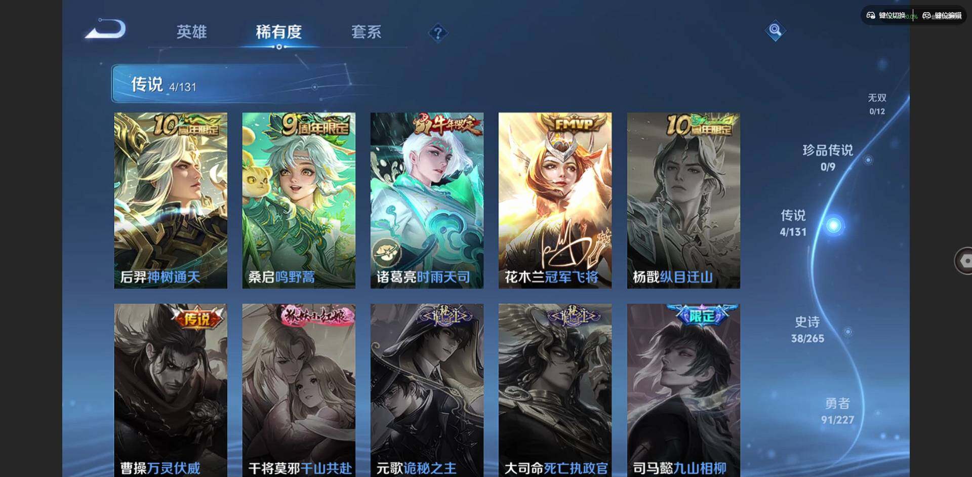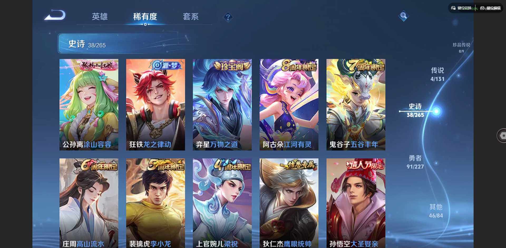 贵族等级: V6 英雄数: 125 皮肤数: 179 传说皮: 冠军飞将,神树